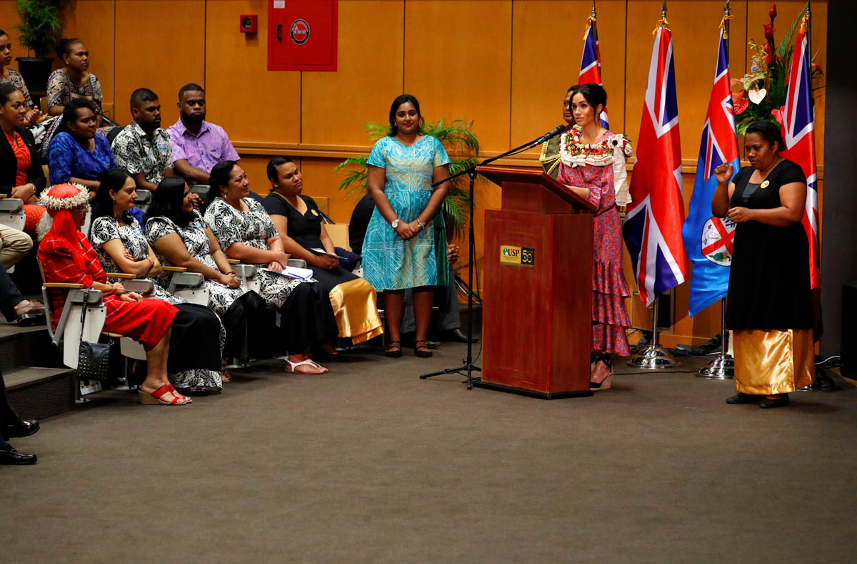 Royal Meghan gave us a break from all that belly-cupping today. There were no incidents of belly-cupping from the videos and the images that I’ve seen. I appreciate it. I prefer the public speaking. Here is where she excels. She is, by far, the most effective speaker in the family. And she gave her first royal tour speech today at the University of the South Pacific about educational opportunities, especially for women.