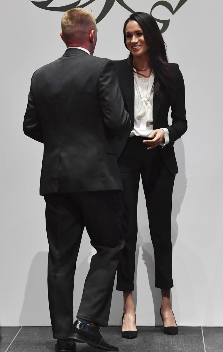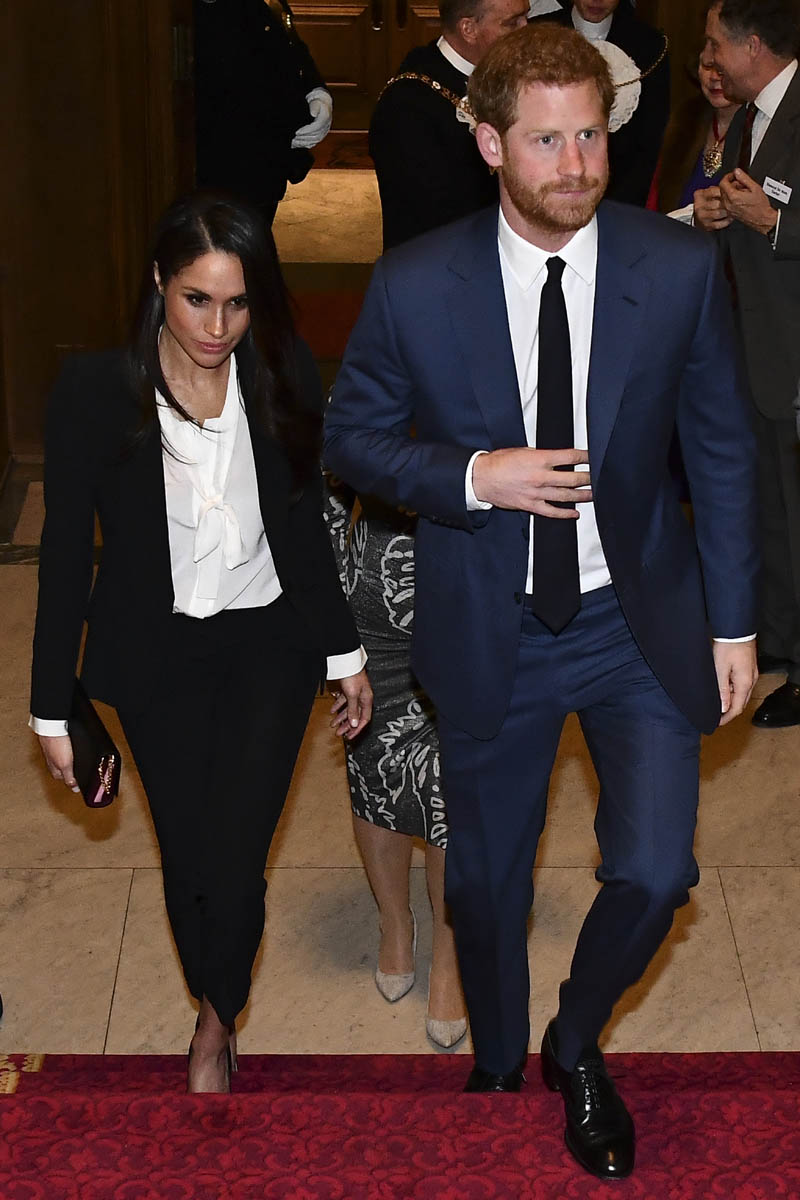 Smart move here by Meghan by avoiding a dress-off. Kate was at a palace, she had to respect the occasion and her hosts and put on a princess gown. Meghan’s tuxedo was perfect for her occasion too and this way the comparisons were avoided. It’s an encouraging sign going forward about how she understands her position and how she’ll negotiate it diplomatically. She’s showing us here that she knows that even though there’s been so much attention on her lately, she respects that Kate is the one who will be Queen and that she’s not here to famewhore the spotlight. At least not all the time.