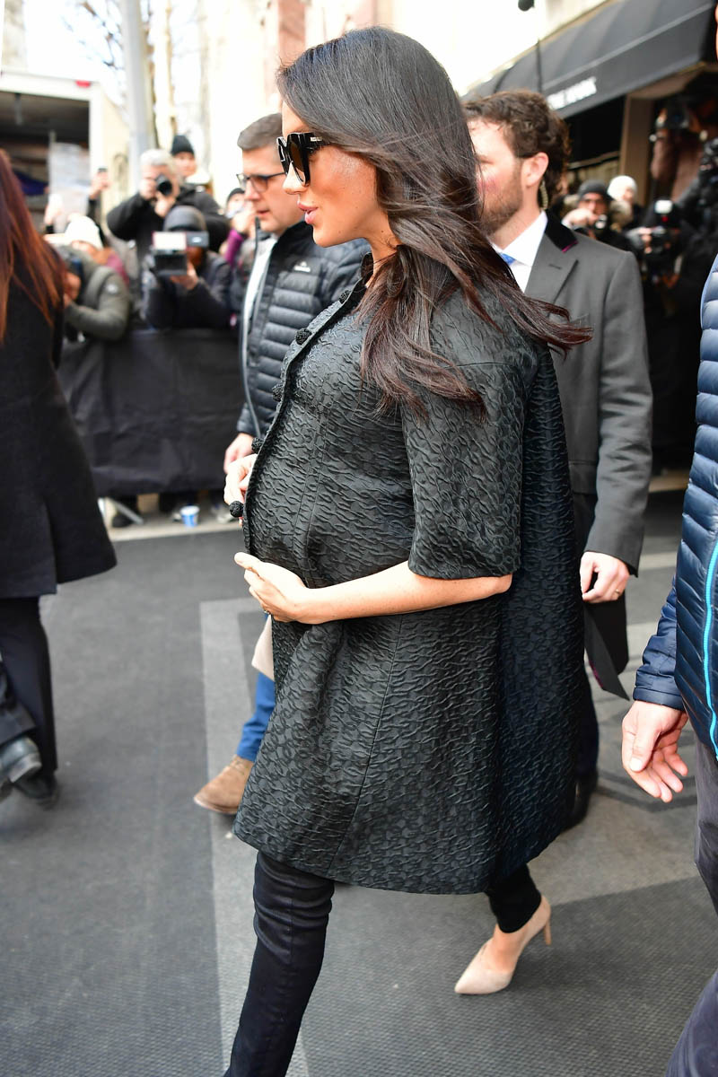I’m not sure we’re seeing much compliance from Royal Meghan lately. Which is what we’ve been building to over the last couple of months and the message she may have thrown down with her extreme belly-cupping in December at the British Fashion Awards. This is what I wrote at the time: