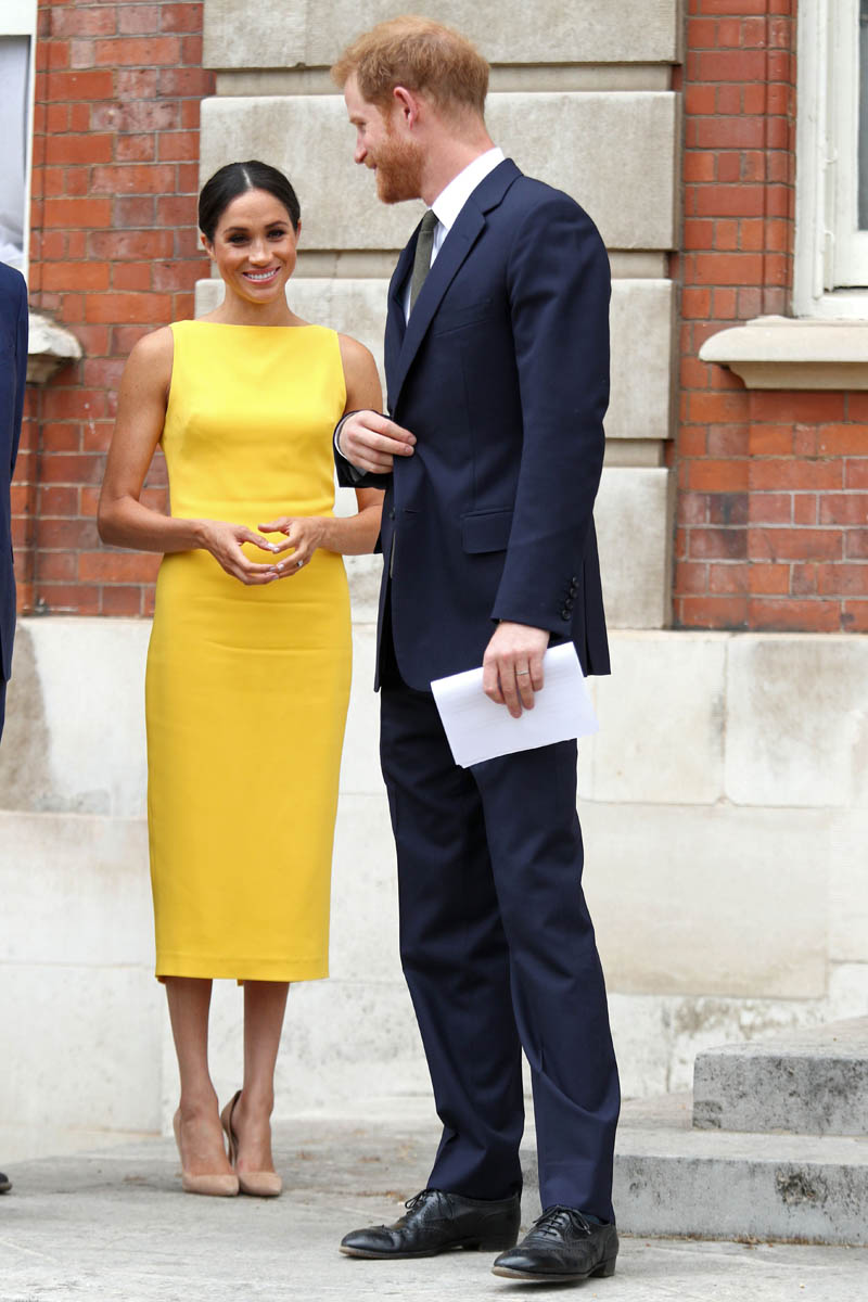 As for this yellow dress, it’s about as safe of a look as possible. There is nothing to criticise. Which means it’s boring AF but the colour does look spectacular on her. The Queen would approve. Her Majesty does love the brightness. And, thankfully, I think maybe Meghan’s fixed that goddamn makeup problem or she was taught to blend her blush and bronzer more evenly.