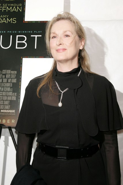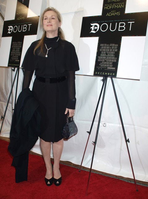 Meryl Streep last night at the premiere of Doubt, still dressed in character perhaps as Sister Aloysius, said to be yet another slamdunk Oscar nominated performance.