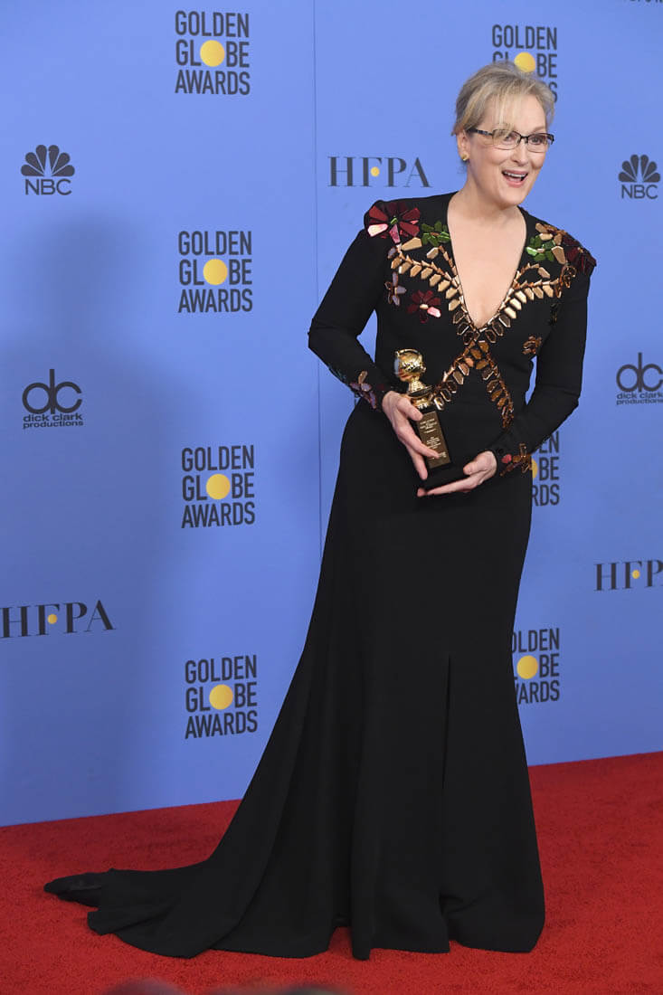 It’s inspiring enough to make you forget about the inexplicable purple font in the celebration of Meryl’s achievements package -- but not so inspiring you forget to notice the dress she was wearing. What exactly would you call that style? How...exactly would you describe it, if you had to?