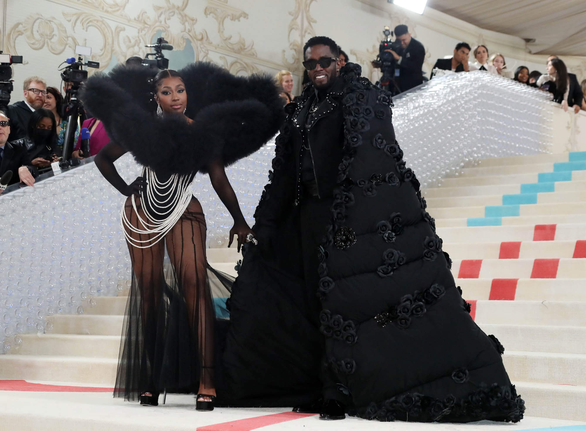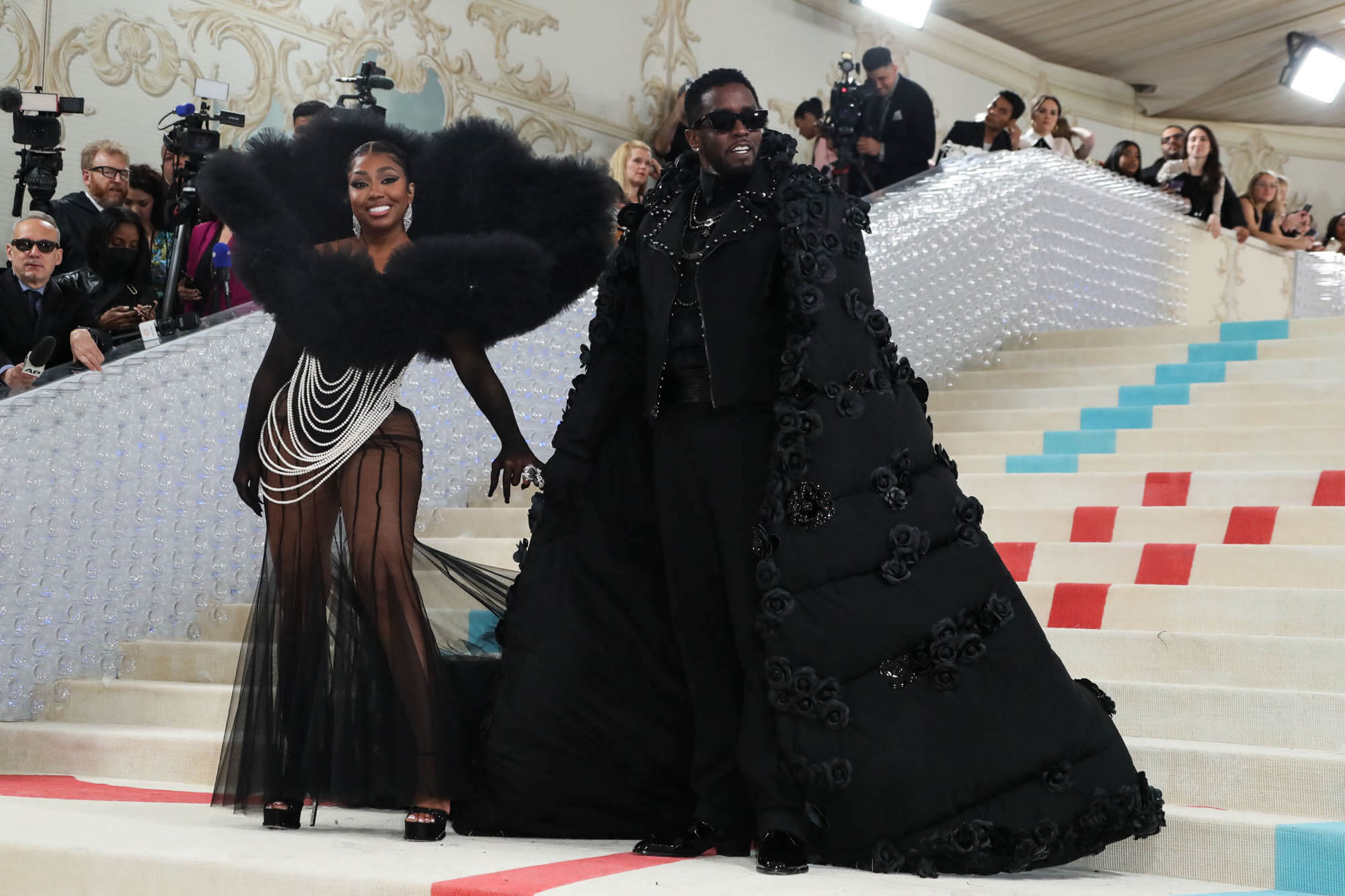 Well, they looked cute together posing up and down the steps, all smiles. Between them, Diddy was actually the style star. He returned to designing clothes for the first time in ten years to create a Sean John original for the Met Gala. His once-iconic streetwear brand’s first-ever couture look. I loved the cape, which was covered in satin camellias as an ode to Lagerfeld’s Chanel.