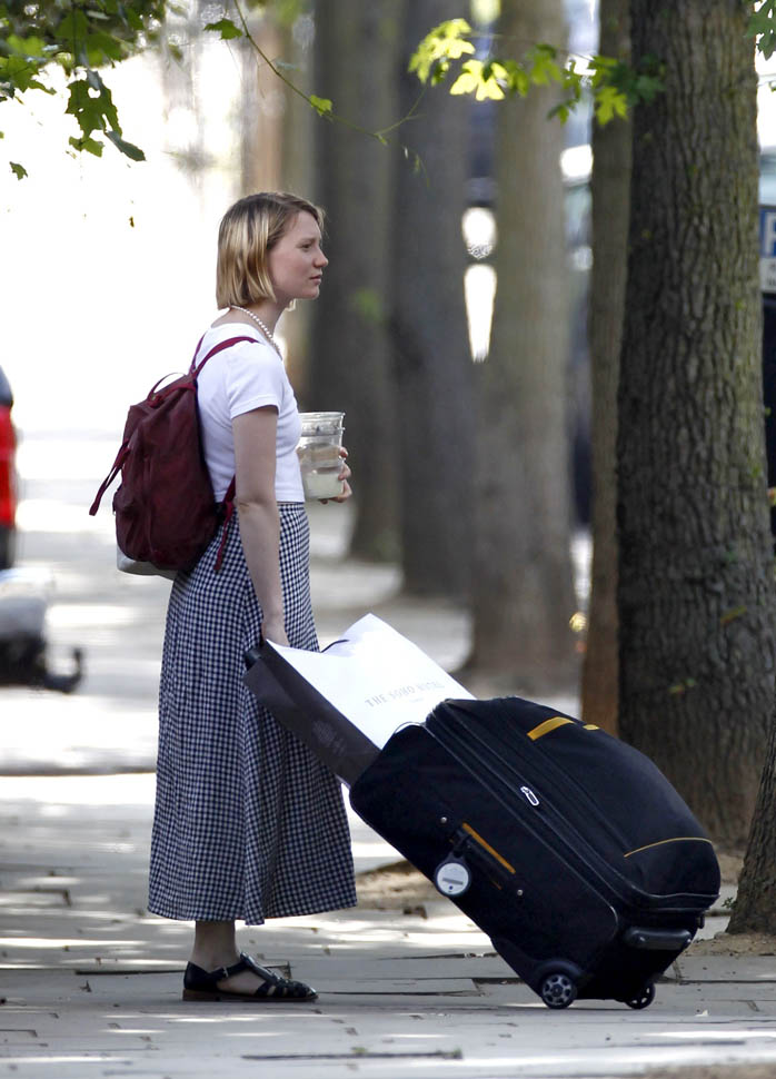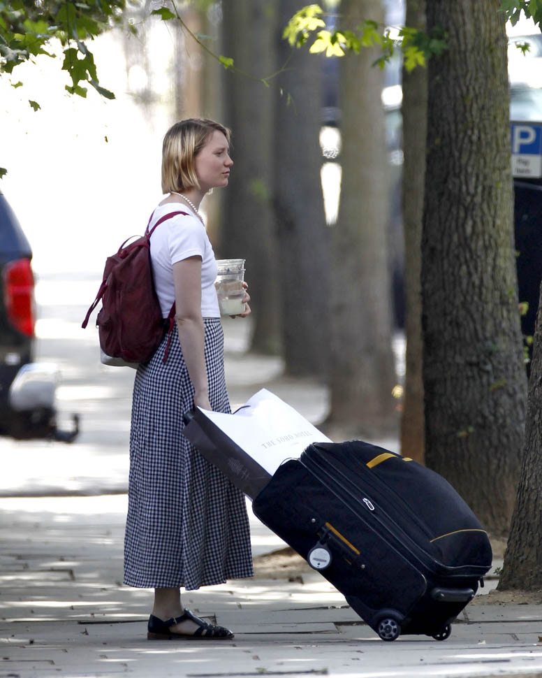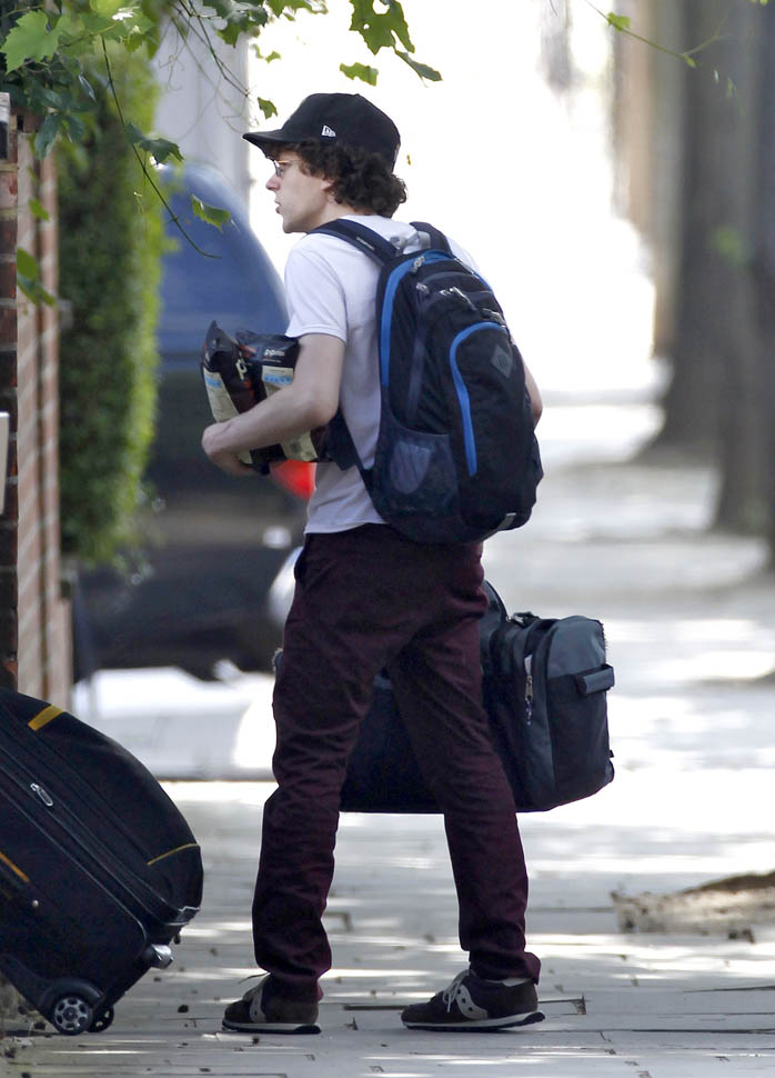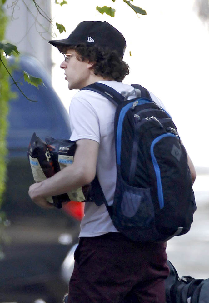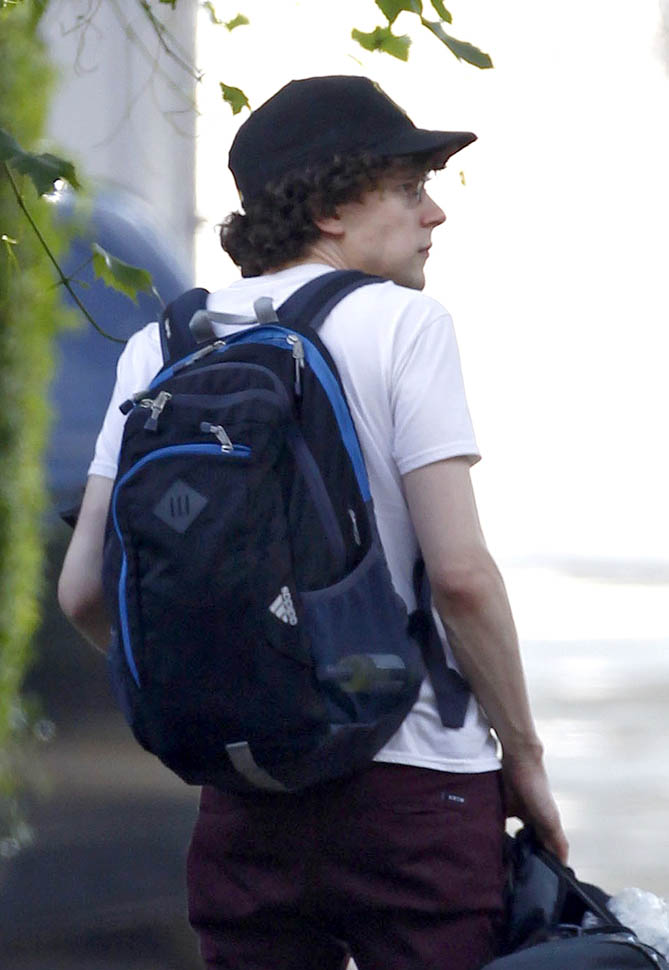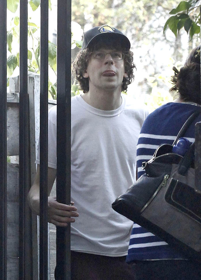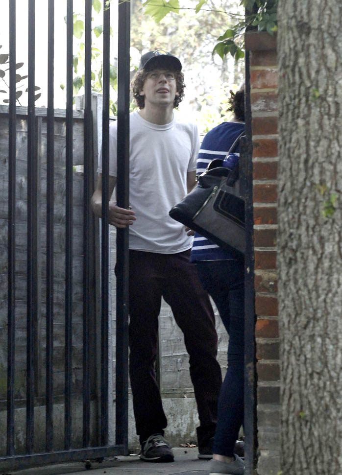 Here’s a relationship update: Mia Wasikowska and Jesse Eisenberg are still together. They were photographed in London today after checking out of their hotel. Jesse was working on American Ultra with Kristen Stewart in late spring. And then he spent a couple of days in June shooting Batfleck and Superman, playing Lex Luthor. Rumour has it, they did not shave his head. And supposedly the character is super twitchy like he’s all hopped up on coke. If you believe that, get ready because this is not your dad’s Lex Luthor. That said, speculation has been wild about how the Batfleck and Superman plot will unfold. Do nerds care about whether or not Lex Luthor has hair?