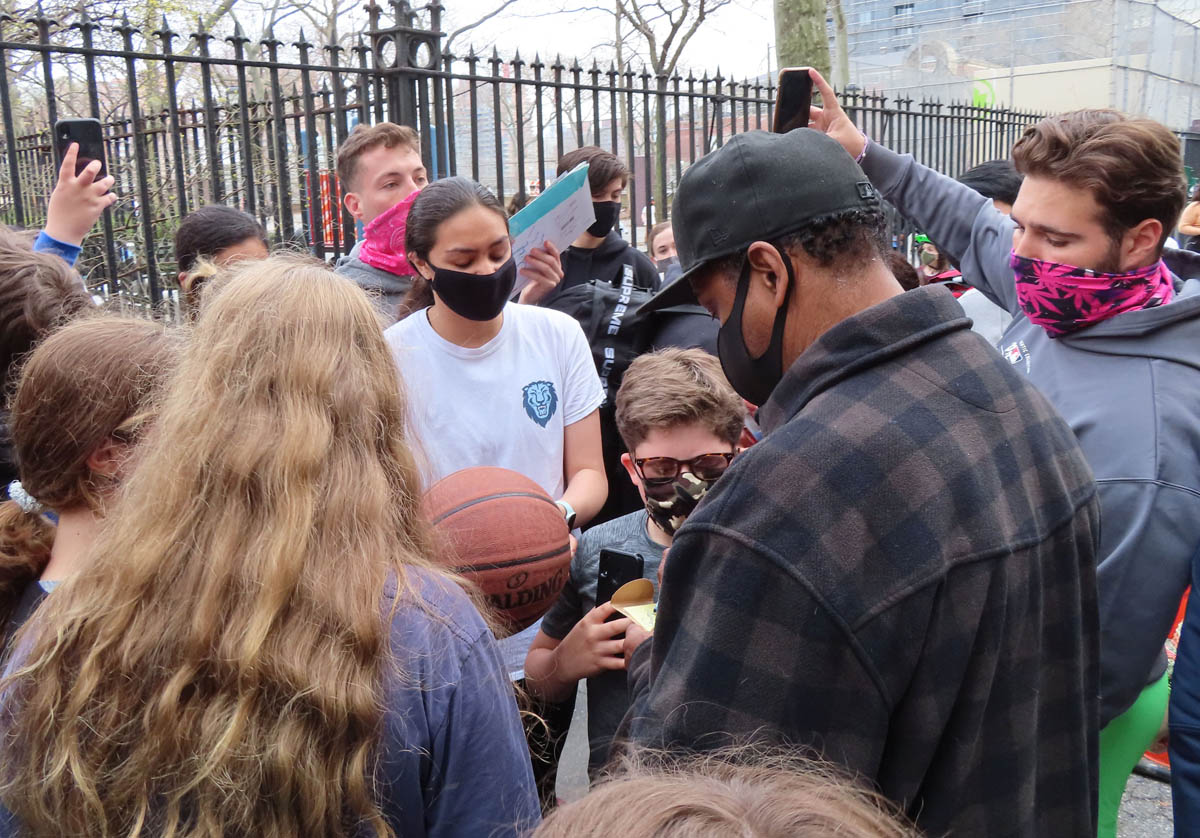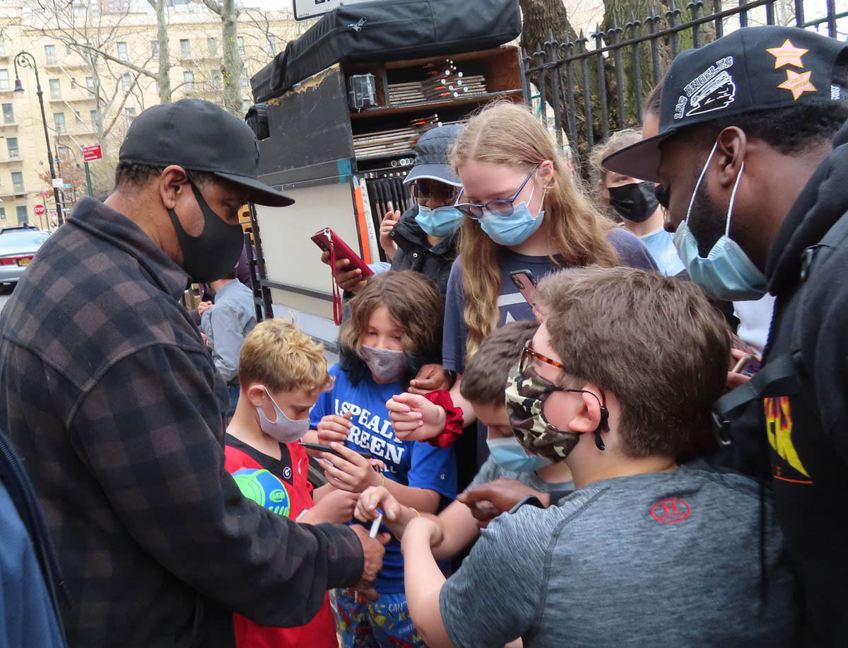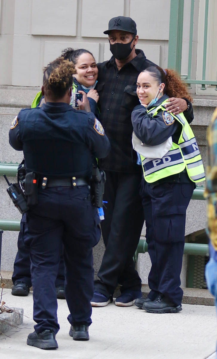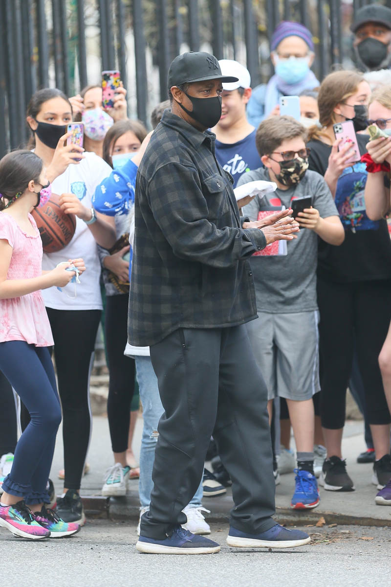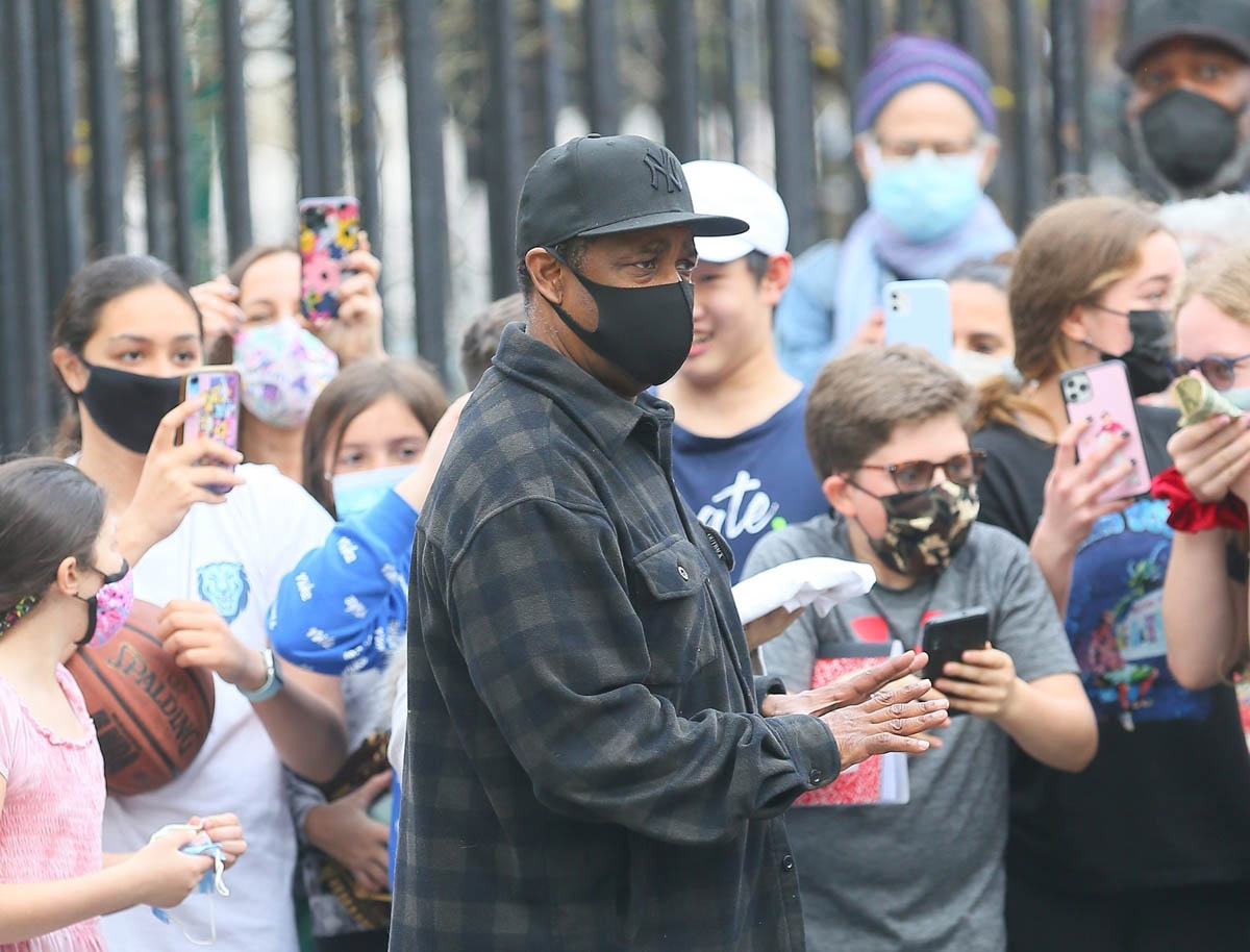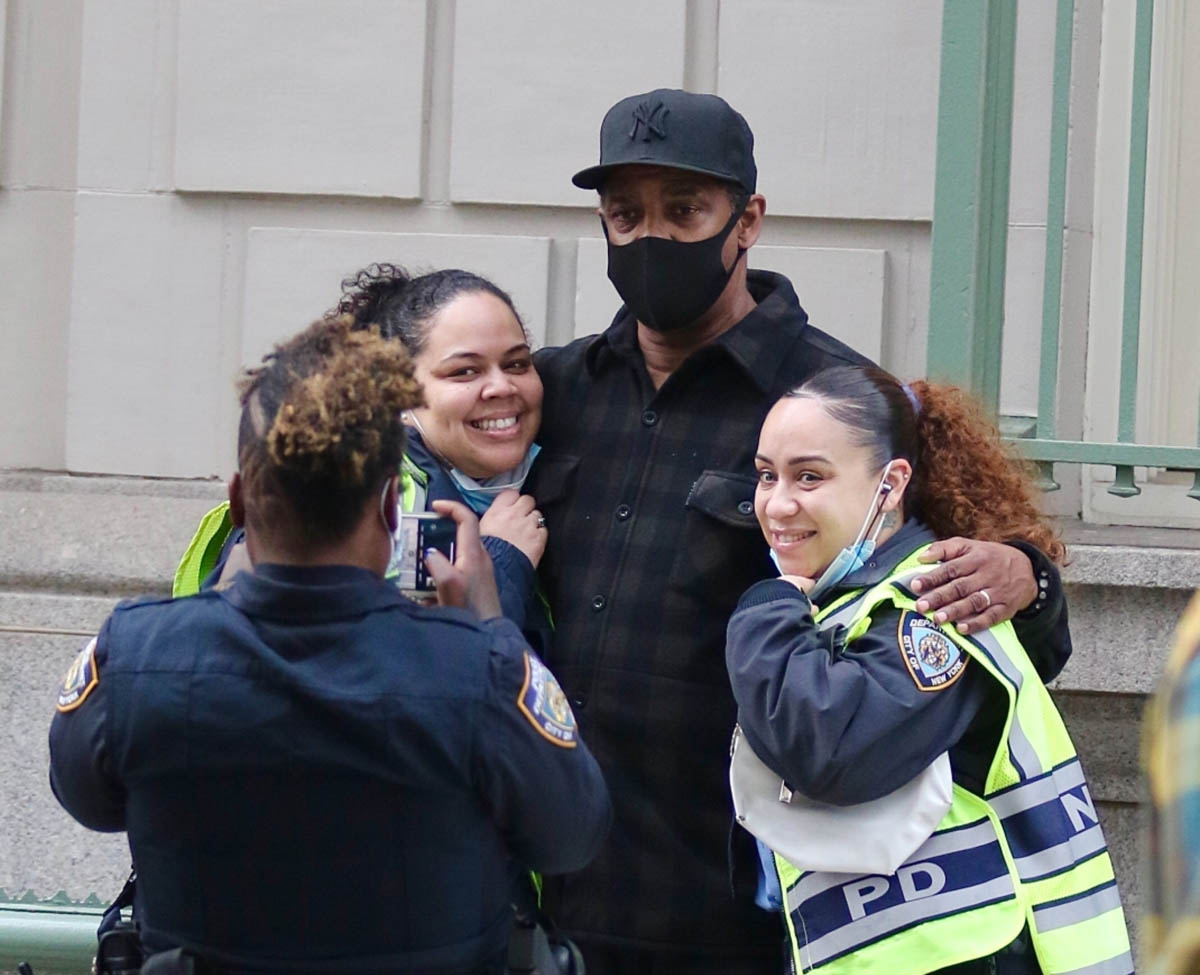 Before March 2020, it wouldn’t have been unusual in New York to see a group of people in close proximity with their phones up trying to get a glimpse of a celebrity. Now it seems like we’re making a return to that, with masks. This is not happening where I live, because our vaccination process is embarrassingly slow, but these are the kind of pap photos we hadn’t seen in a while. And that may also be why Denzel has the time to take pictures with the kids, to pose for selfies, and generally just connect with people. Because we all need connection. Not that he wasn’t this great with fans before. My point is that he, as a leader in the industry, is taking the time to do it. You’ll note that even the security team and the police assigned to protect the set were getting into it.