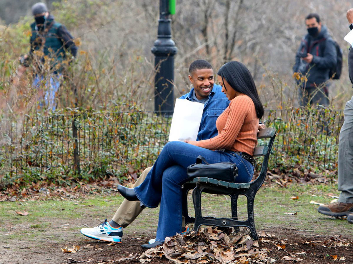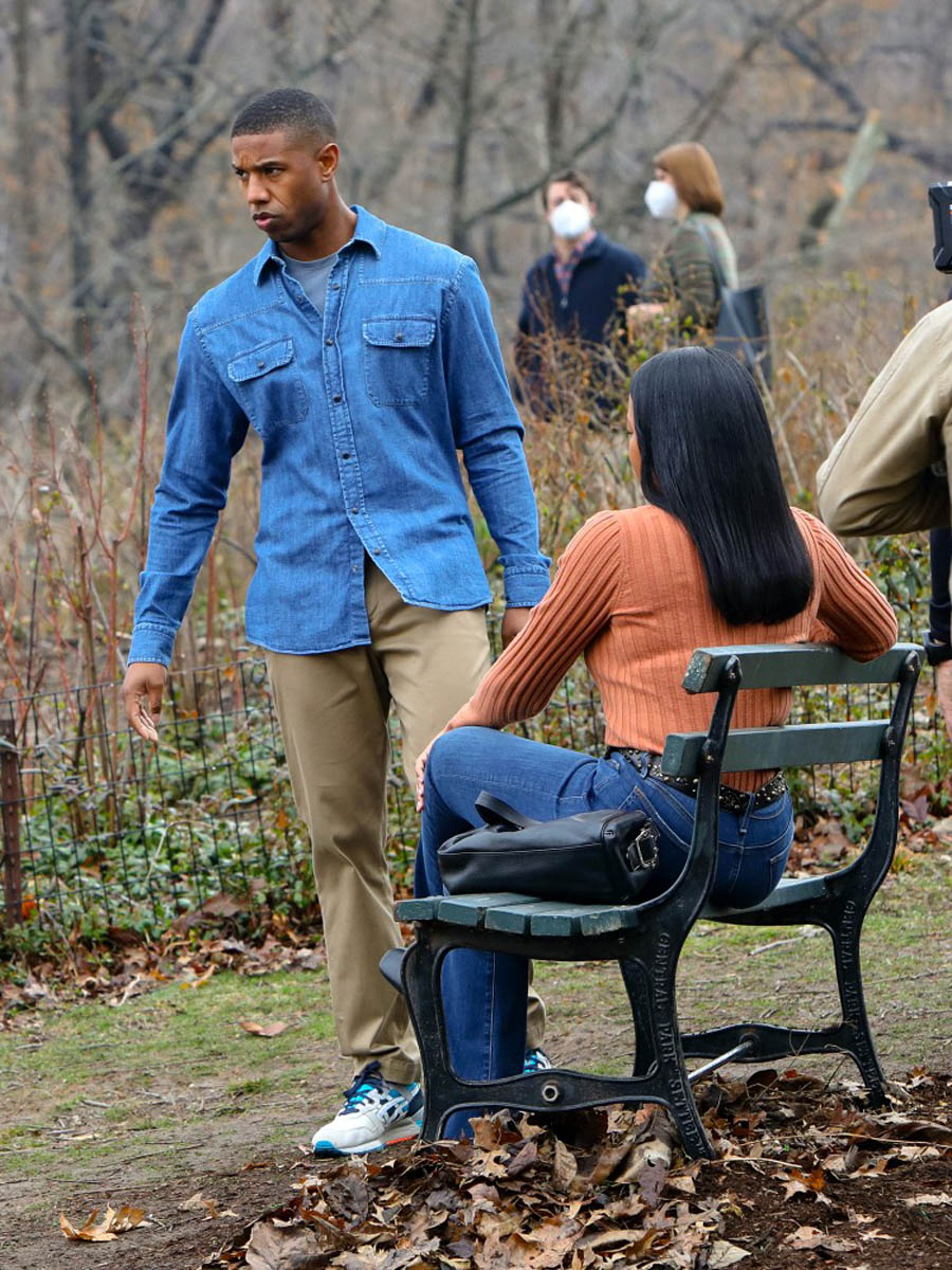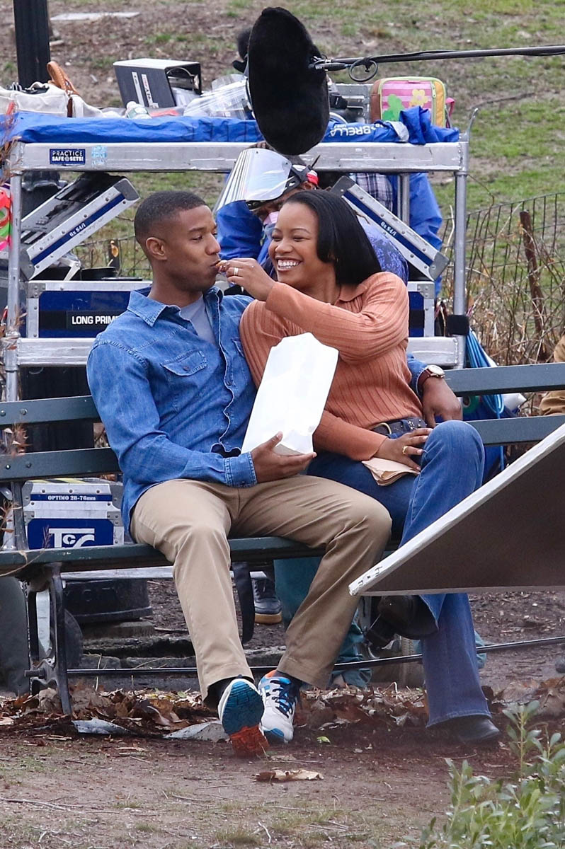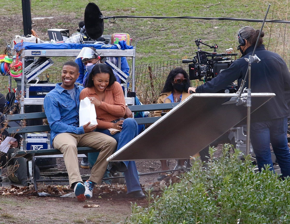 Here are Michael B Jordan and Chanté Adams today in Central Park working on the film Journal for Jordan, directed by Denzel Washington based on the memoir by Dana Canedy about her relationship with US Army First Sergeant Charles Monroe King and the journals he left for their son who was just seven months old when King was killed in Iraq in 2006.