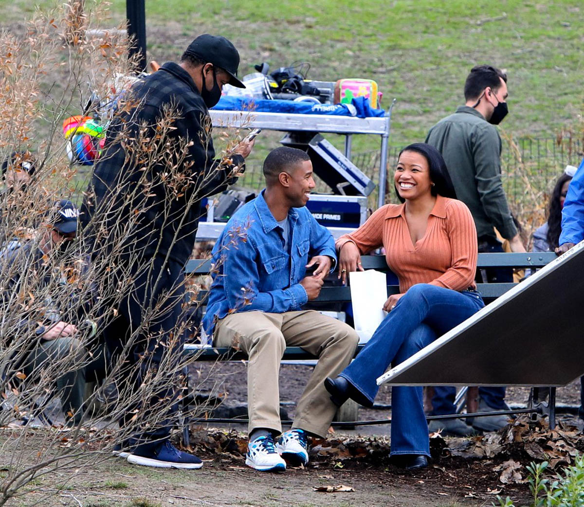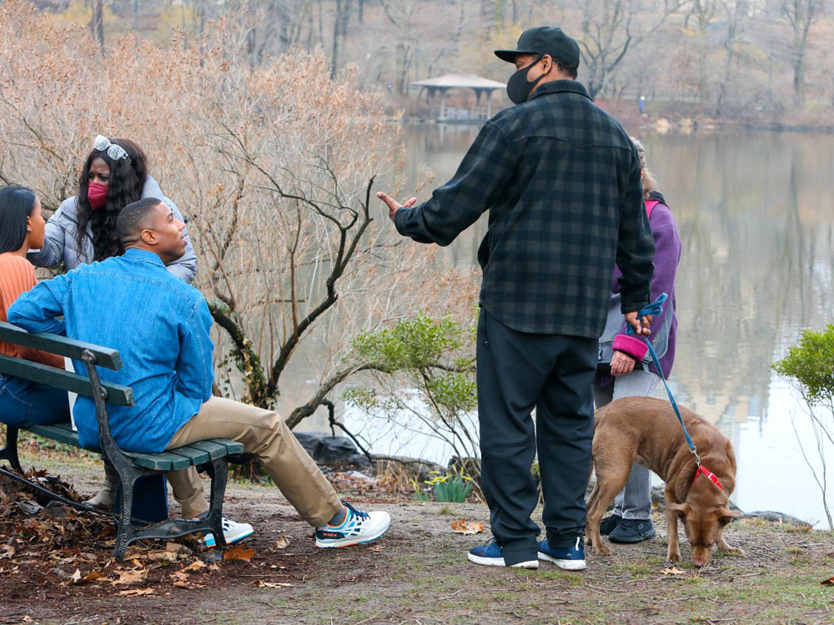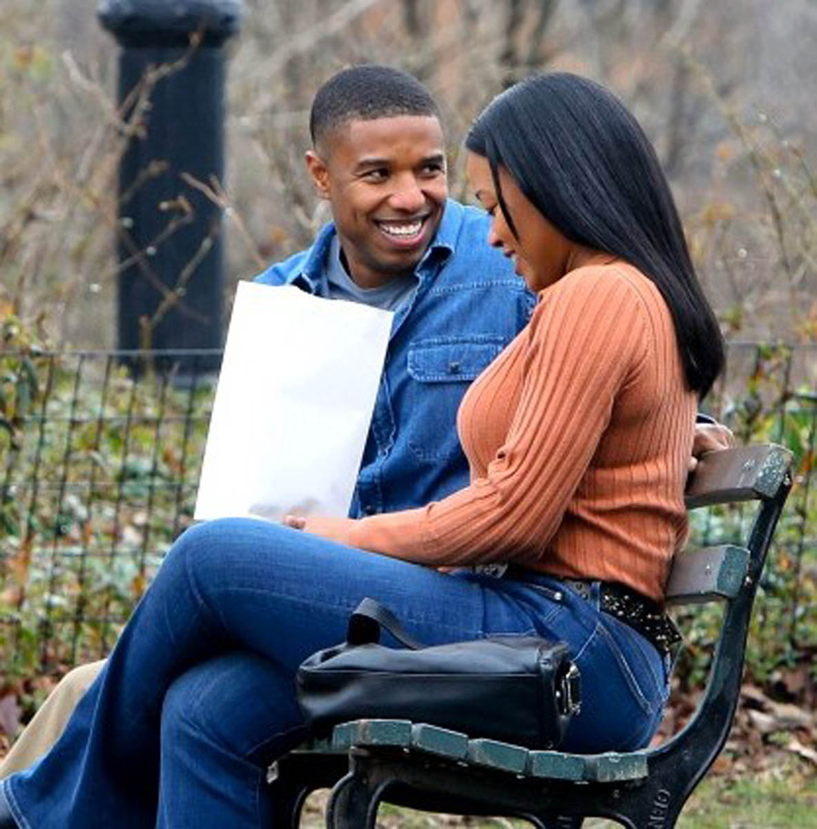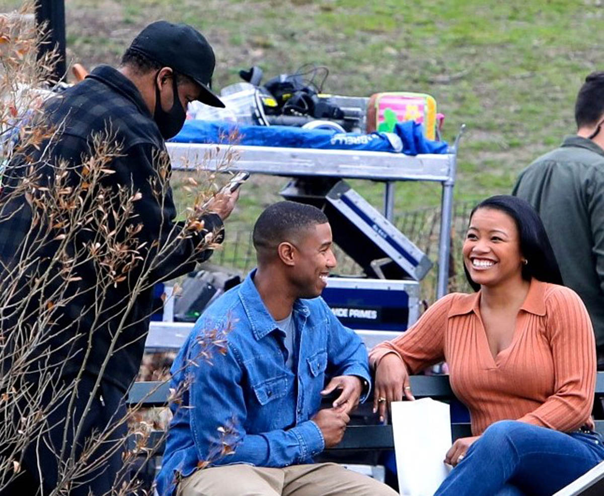 Here are Michael B Jordan and Chanté Adams today in Central Park working on the film Journal for Jordan, directed by Denzel Washington based on the memoir by Dana Canedy about her relationship with US Army First Sergeant Charles Monroe King and the journals he left for their son who was just seven months old when King was killed in Iraq in 2006.