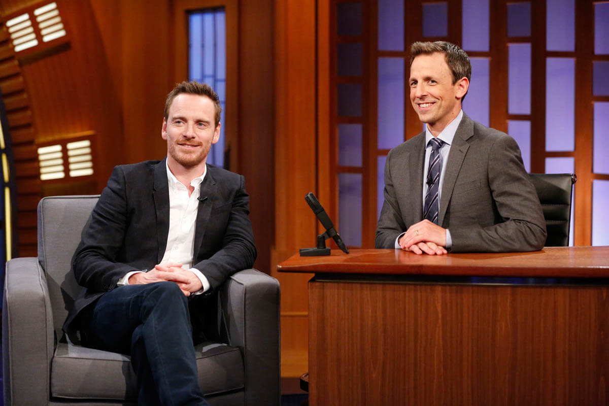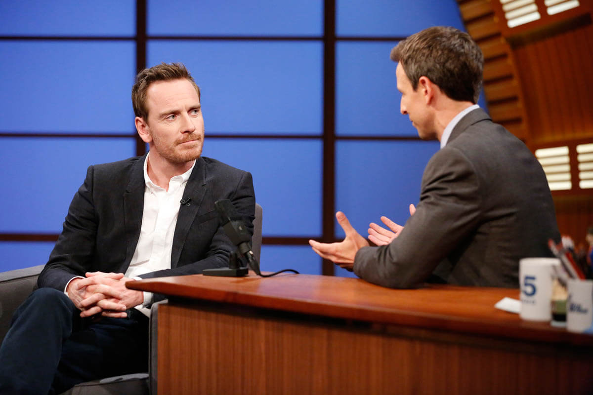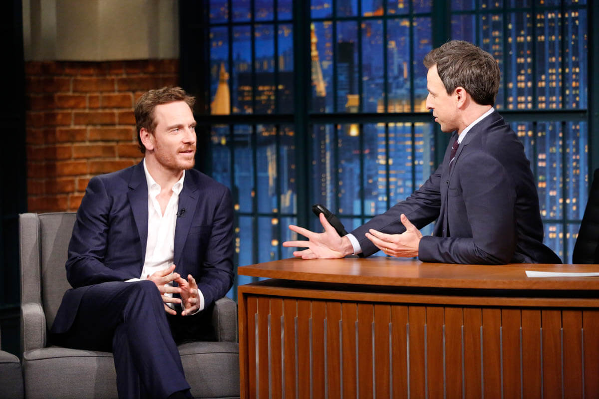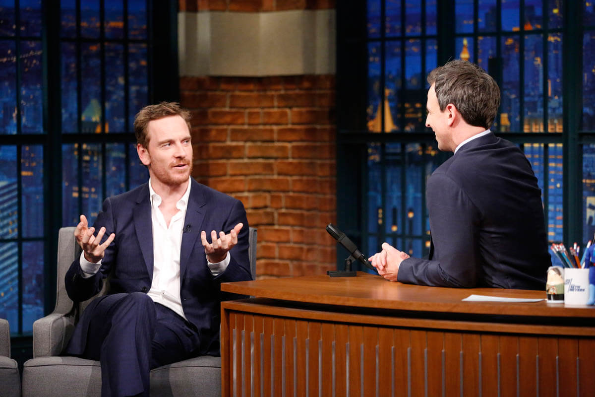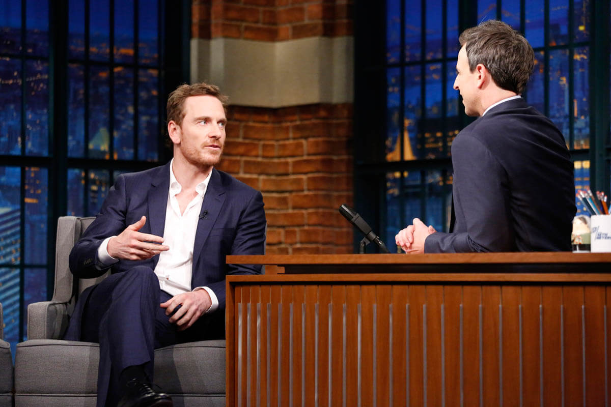 Michael’s been trying to promote Assassin’s Creed for a few weeks now. Last night he was on with Seth Meyers. Last week he did an air guitar-off with Jimmy Fallon. It wasn’t bad. But in terms of good TV, there is no producer that will tell you that air guitar battle is better than lip sync battle even though, maybe, lip sync battle might not be as “cool” as air guitar battle. That’s almost the point though. You have to be willing to get real silly to lip sync battle. The more you commit to being silly, the more cool you become in exchange. So, no, I’m not all that impressed with Michael Fassbender’s air guitaring. To me it feels like a half-step. At this point though, I’m not sure what he’s trying to preserve.