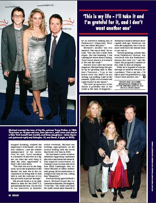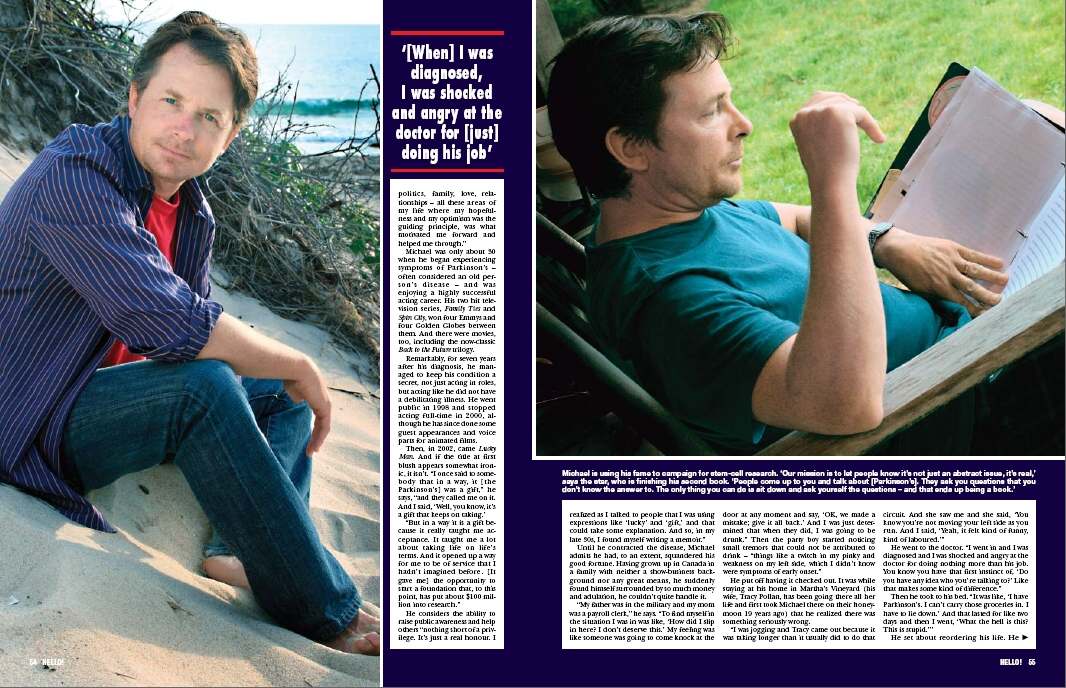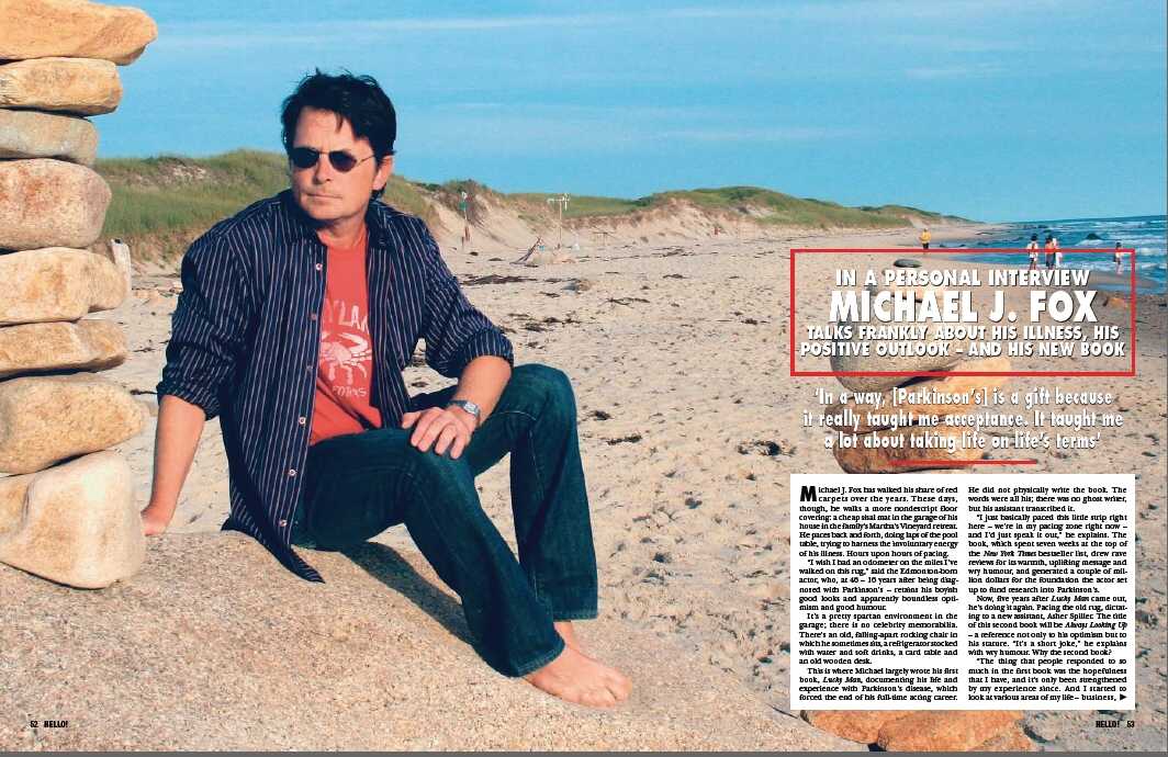 Time for a break from the twats and the twits. New issue of Hello Canada on stands today features a wonderful interview with Michael J Fox. As you know, Michael has been living with Parkinson’s for 16 years. His first book Lucky Man was released in 2002 and was an instant bestseller. Michael couldn’t “write” the book himself but he dictated every word to an assistant while pacing back and forth in his garage. And he’s doing it again – a second book called Always Looking Up, a tongue in cheek reference to his height and of course his outlook on life.