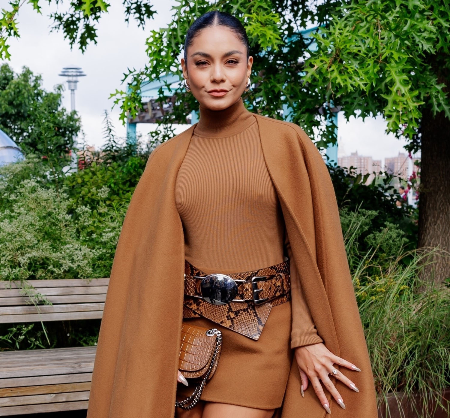 I do however enjoy Vanessa Hudgens in brown – a fall look if I ever saw one: belted turtleneck dress, cape over the shoulders, high boots, and hair middle part slicked back. It’s a classic, you could wear it 40 years ago and you can wear it 40 years from now.
