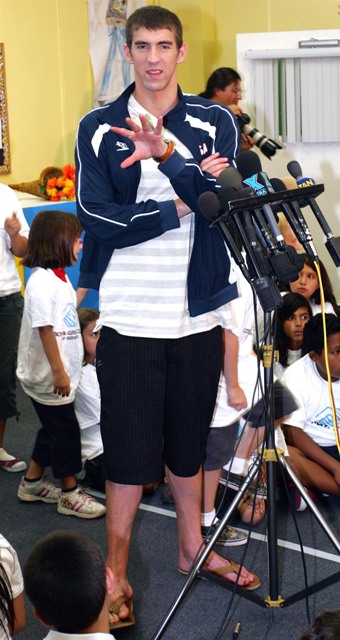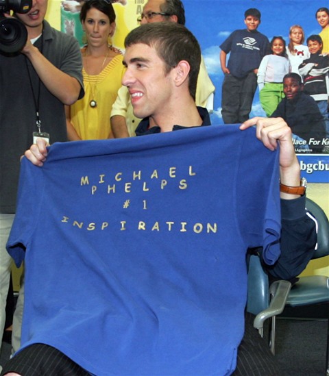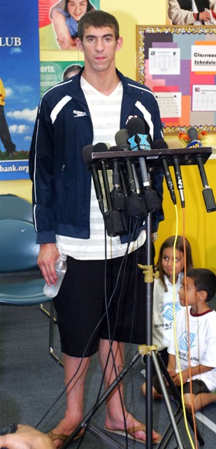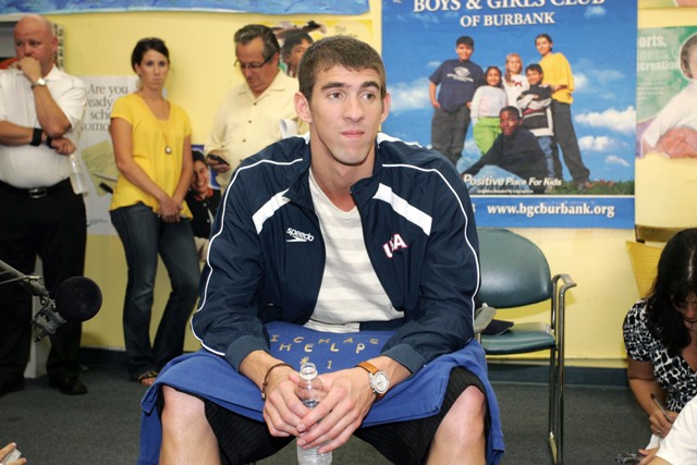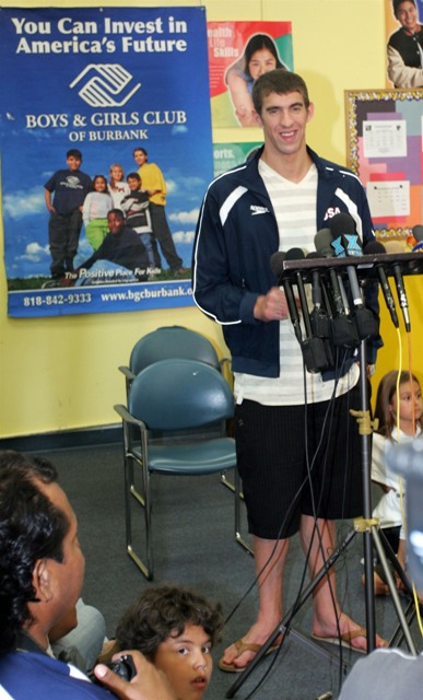 Here he is earlier this week announcing a $1 million donation to the Michael Phelps Foundation at the Boys and Girls Club of Burbank.