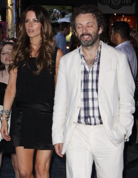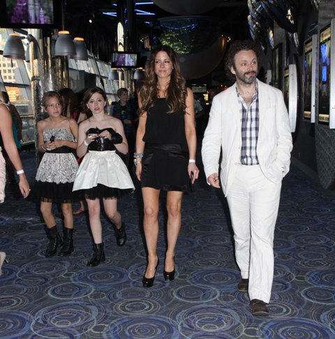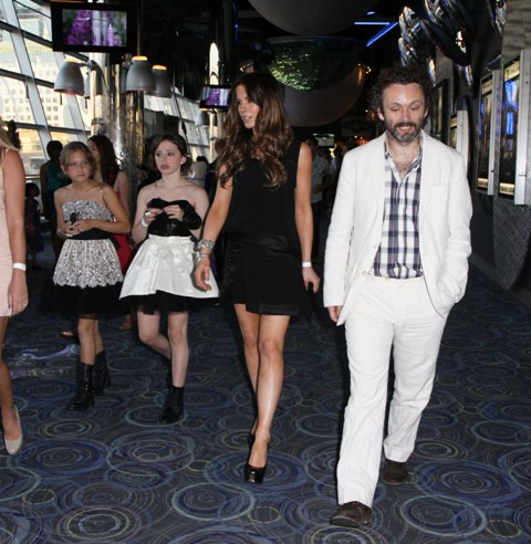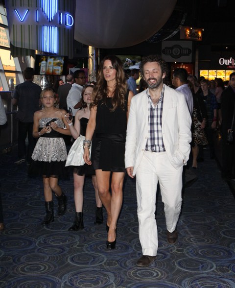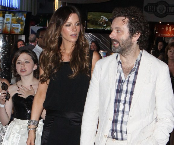Michael Sheen is in Toronto as his daughter Lily is here with her mother Kate Beckinsale. On Tuesday, Michael and Kate took Lily to the Canadian premiere of Harry Potter and the Deathly Hallows Part 2. They walked in with everyone else, no special treatment, and took some medium seats on the side. He got up to look for better ones. And that's when the publicity people noticed him and took them over to reserved seating, which was where they were originally supposed to be. It's just that when they arrived, they didn't make a production out of announcing it. Michael was blushing about changing seats, almost protesting the move.