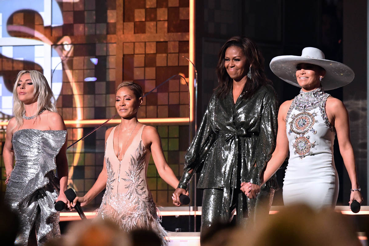 Well, if you want to start your award show strong, starting with Michelle LaVaughn Robinson Obama is one way to do it. I know that the only First Lady we acknowledge didn’t actually open the Grammys (Camila Cabello did with a performance I forgot about immediately after it happened) but it felt like the show didn’t start until she stepped on stage hand in hand with Jada Pinkett Smith and Jennifer Lopez. Gaga was there too. We’ll come back to Gaga and her extra later. We’re also going to come back to JLo. There’s a lot to discuss. Don’t worry. We got you.