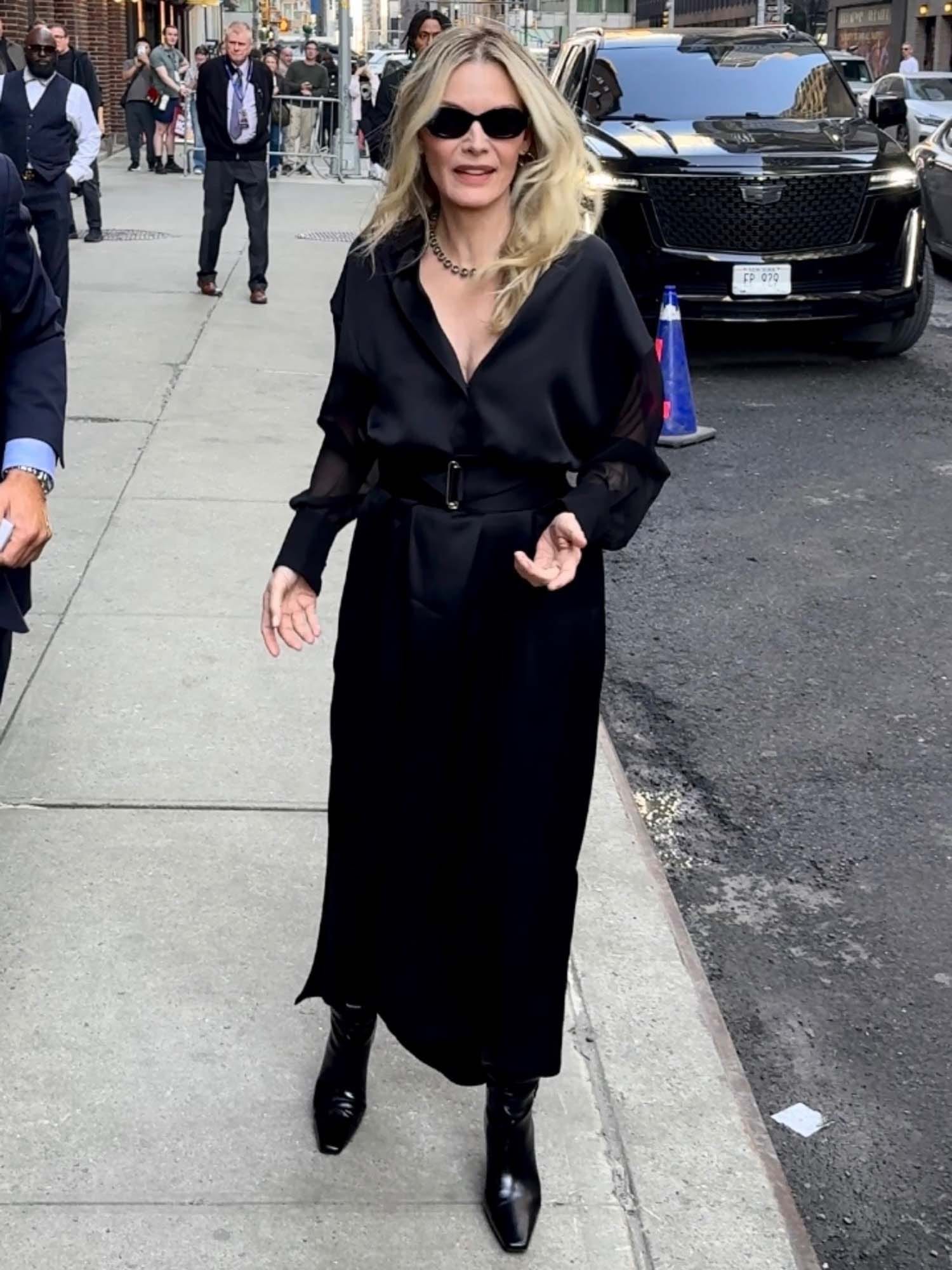 Michelle was at The Late Show with Stephen Colbert yesterday, arriving in a belted shirt dress with sheer sleeves. The fabric of her dress makes it more elevated but the style itself, the belted shirt dress, is everywhere right now because it’s a spring staple. I just tried on a bunch during my most recent fitting for ETALK the other day and there are some really good ones out there – which surprised me, because I’m not a belt girl. I hate wearing a belt, almost always try to avoid it. If there’s a dress that comes with a belt, I will almost always get rid of it. But this is why our stylist, Simone, is so good at her job; she works within my limitations but also knows when to push, slightly. I ended up keeping several belted shirt dress options on the rack to wear as the weather gets warmer.
