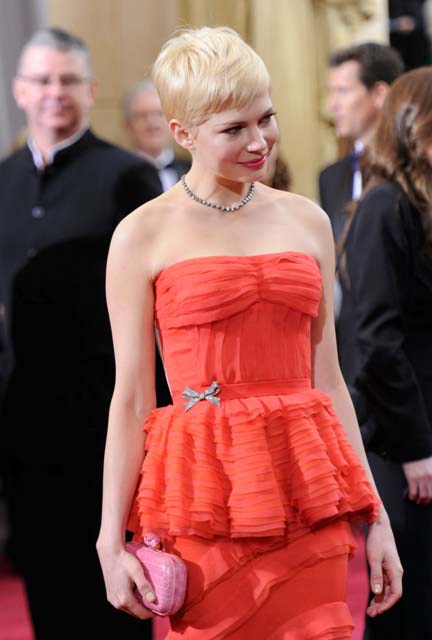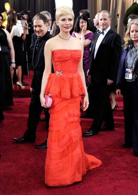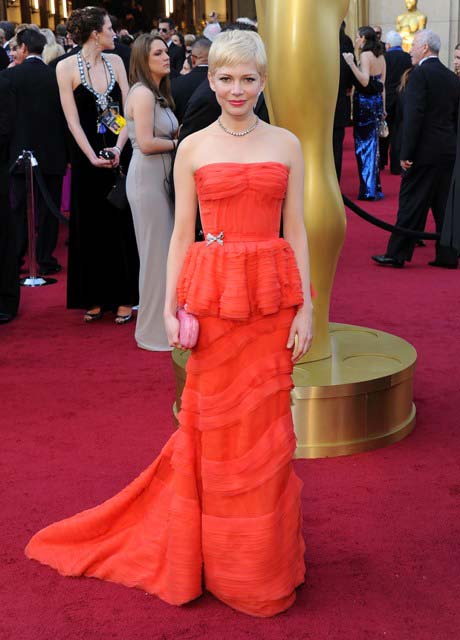 First of all, it was allegedly orange or persimmon or coral or vermillion, except that in actuality, the thing was red. If you're going to wear it on the most important night of the year, if not your career, how about you go ahead and camera test it? It would have been on a lot more people's best dressed lists, I suspect, if it had actually looked to us like what you said it was. AND your peplum is cutesy.