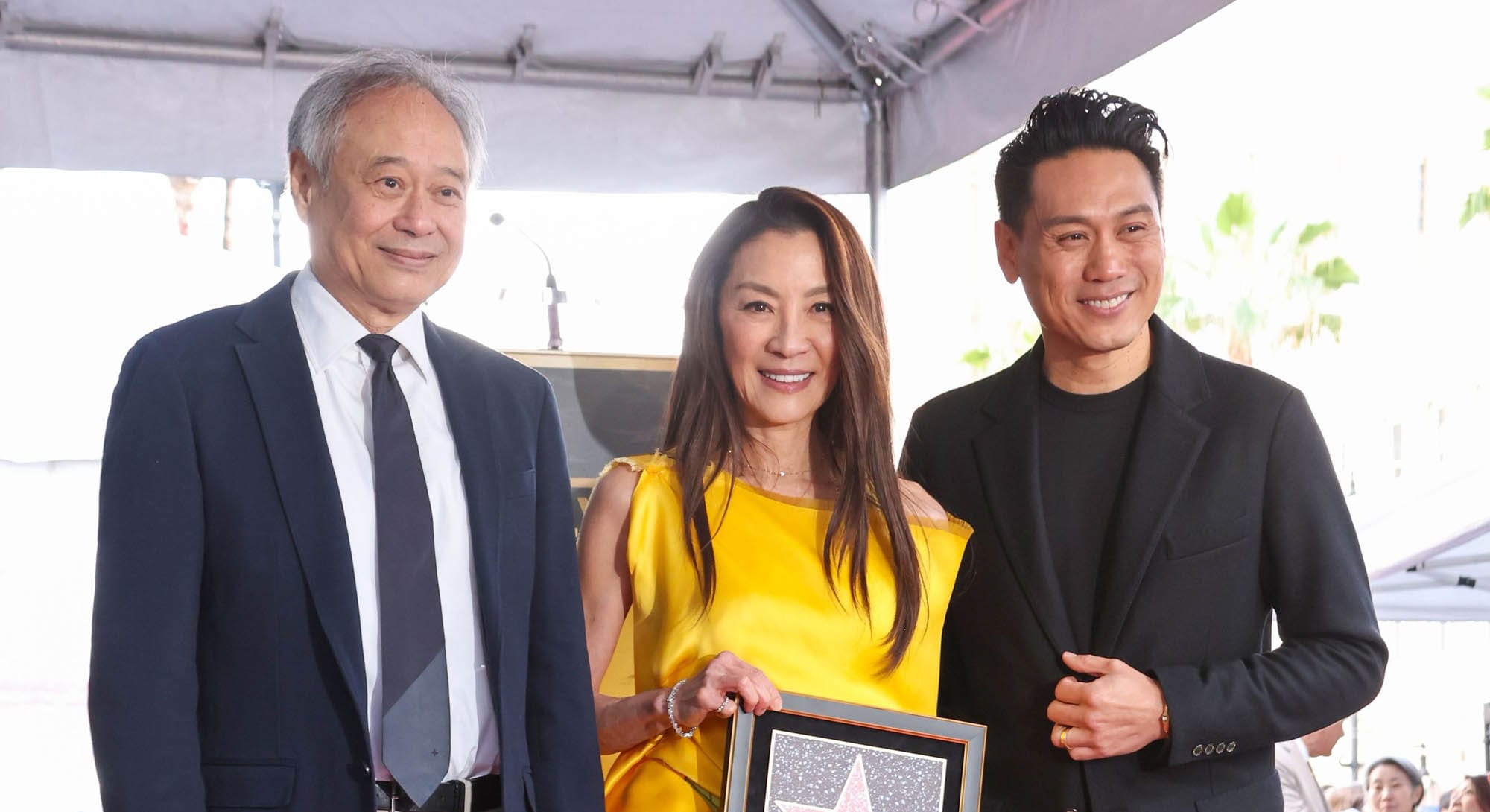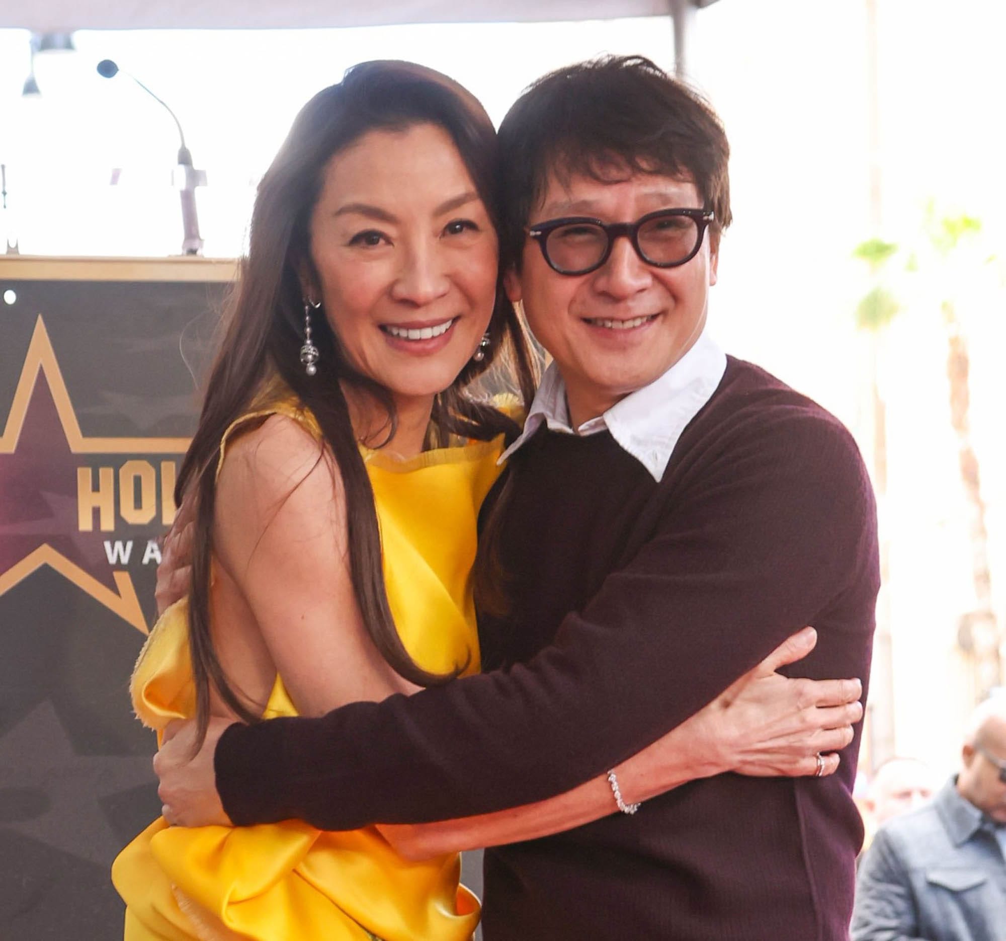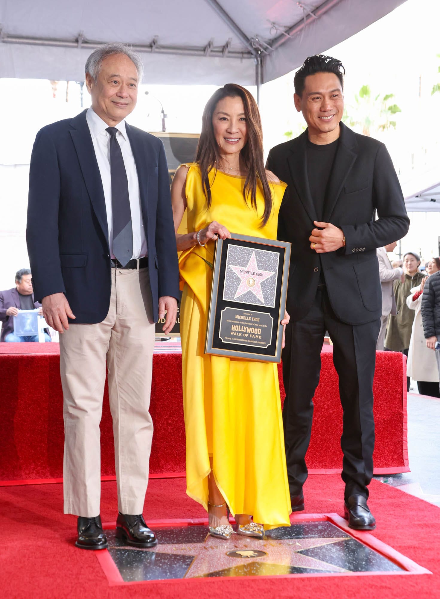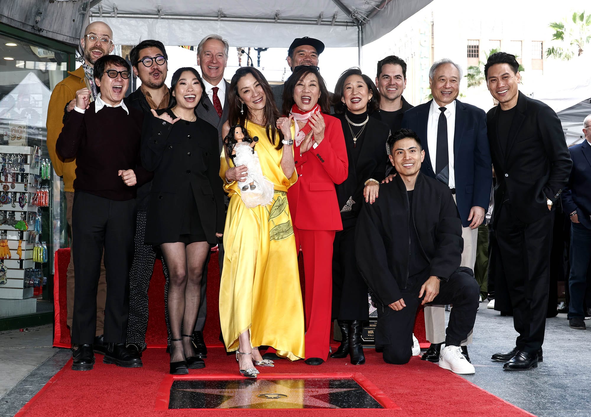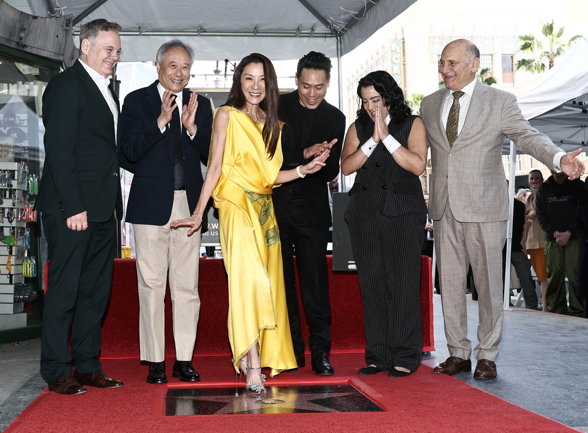 Daniel Scheinert, Ke Huy Quan, Daniel Kwan, Awkwafina, Paul Feig, Michelle Yeoh, Janet Yang, Destin Daniel Cretton, Sandra Oh, Jonathan Wang, Bing Chen, Ang Lee and Jon M. Chu attend the Michelle Yeoh Walk of Fame Star Ceremony on February 18, 2026 in Los Angeles, California