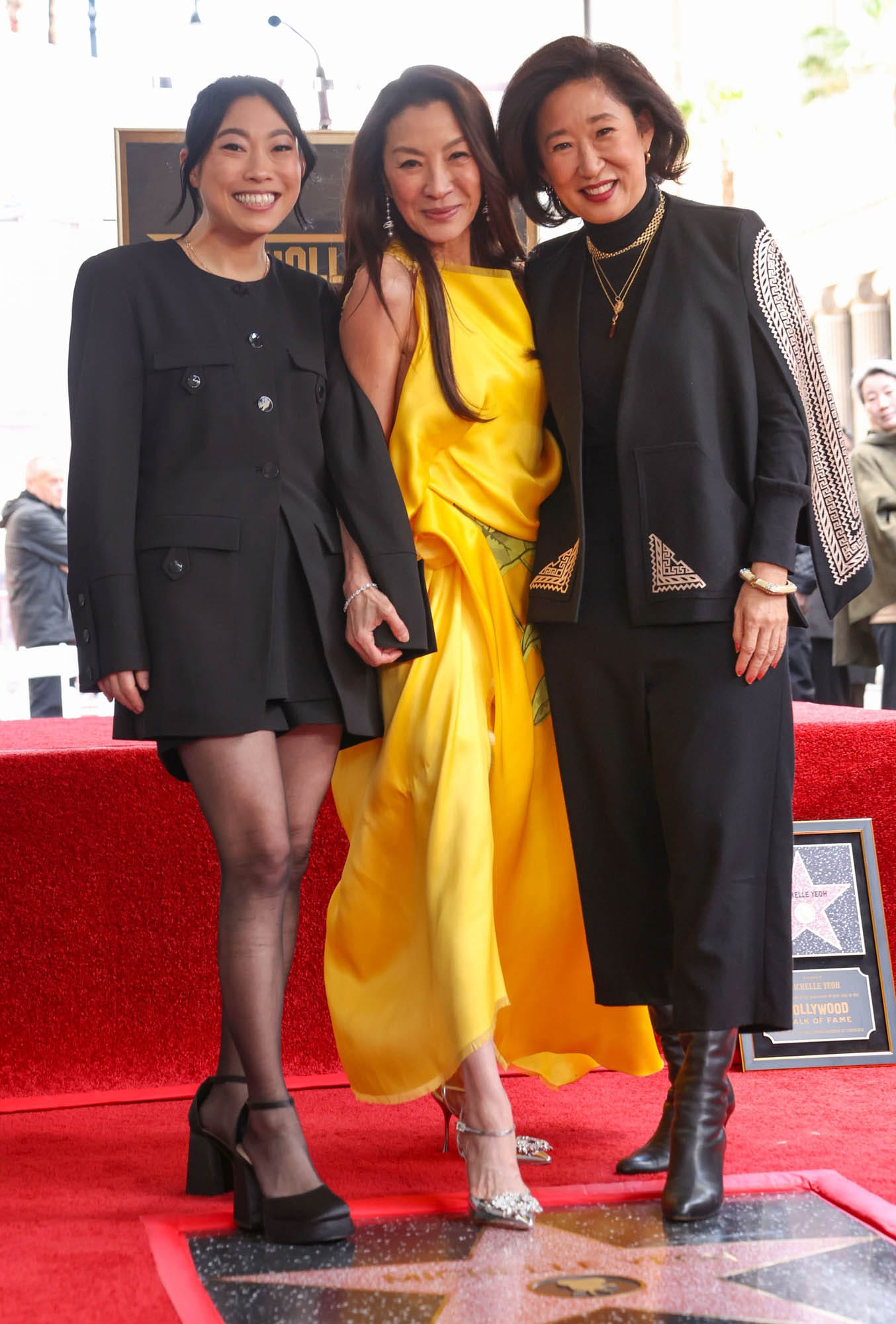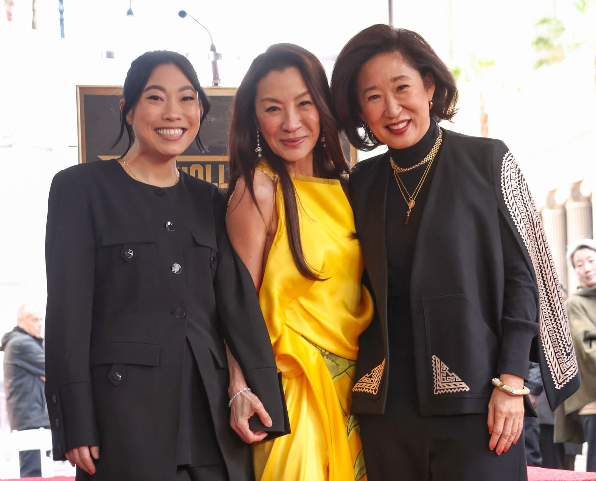Awkwafina, Michelle Yeoh, Sandra Oh attend the Michelle Yeoh Walk of Fame Star Ceremony on February 18, 2026 in Los Angeles, California