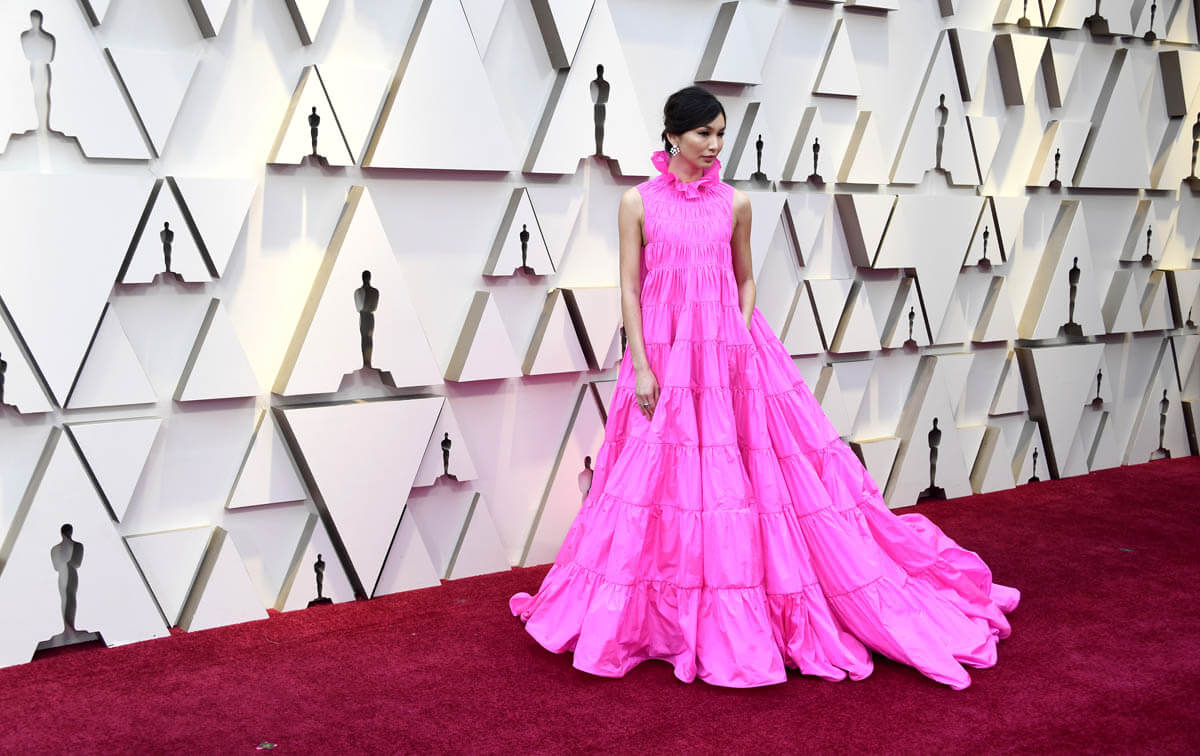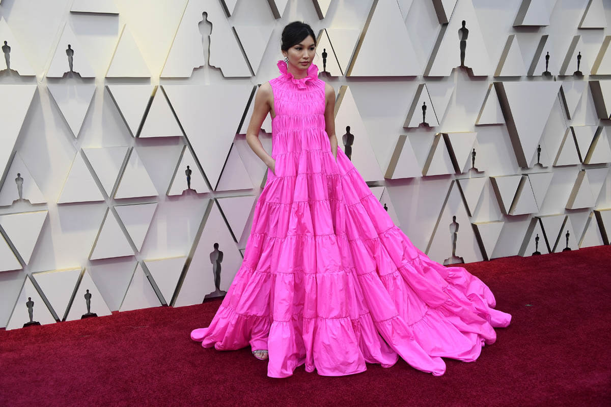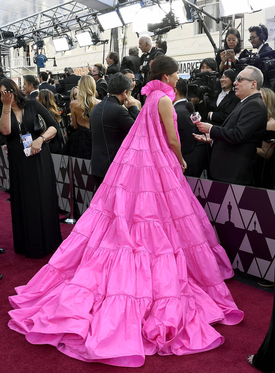 As for Gemma Chan – I was waiting to see this Valentino at the Oscars. You’ll recall, this entire collection was breathtaking. And when I posted about it a few weeks ago, Gemma’s high-collar, tiered bright pink dress was the one I singled out possibly for Lupita Nyong’o. Right dress, different celebrity. But not wrong. This is the one that isn’t complicated. The colour is amazing. The material is no stress. Nobody is worried about wrinkles and folds here. The fit is no stress either. She could move. She did not have to worry about undergarments. She put her hands in those pockets and swung them around. And oh my God, look at it from the back – it’s a dream!