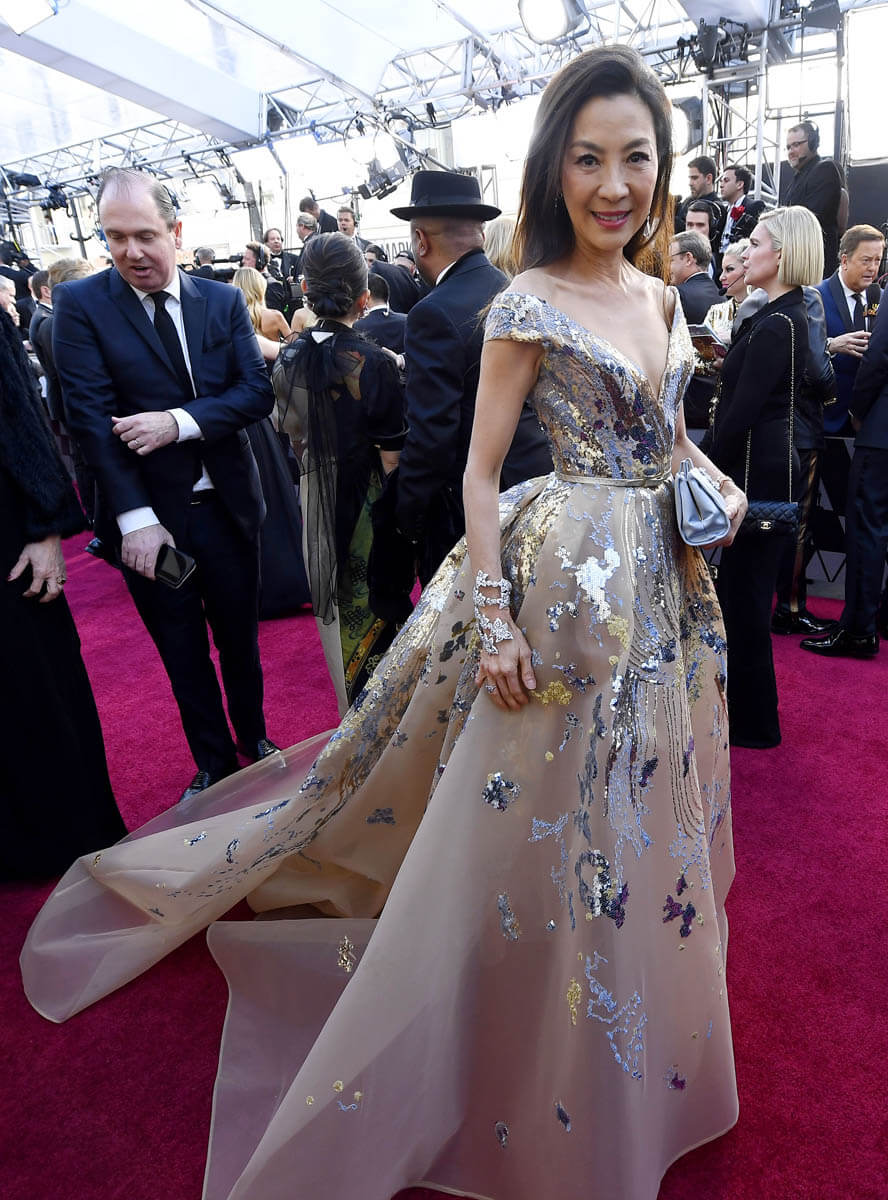 A quick aside before we get to Michelle Yeoh and Gemma Chan’s red carpet looks – remember all that business about fighting over presenters and the Academy telling people that if they presented at any other award shows, they wouldn’t be able to come to the Oscars? One of those people was supposed to be Margot Robbie. She wasn’t at the Oscars last night. I wonder what happened.