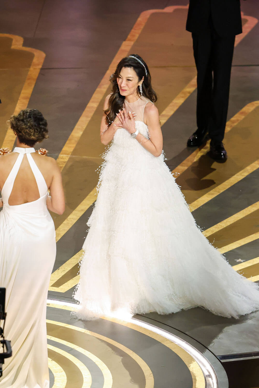 The fact is, Michelle is only the second woman of colour to win in this category. That’s just two women of colour in 95 years, the other being Halle Berry. Who presented to Michelle! And I’m not trying to say that Halle was there to jack Michelle’s moment, of course not. But the fact is, with their history and the Academy’s history, it had to have been a moment for Halle too, because she has spoken many times, in the years since her Oscar win in 2002, about her disappointment that her win “didn’t open doors”. And while her acceptance speech back then specifically cited Black women, like Dorothy Dandridge, Diahann Carroll, and Angela Bassett, who ironically was in the audience last night, there’s no doubt her excitement for Michelle was also balanced out by her own experience of having to wait over two decades to see another woman of colour now join her in this very small club of two. Both things can be true.