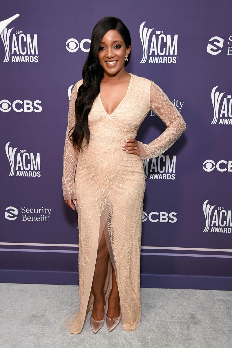 Seems like any time Mickey Guyton is at an award show she makes history. She did it again last night at the Academy of Country Music Awards when she hosted. And, as award show hosts do, there were several outfit changes. My personal favourite of all of them is this one – white, one shoulder, loose but structured, with feathers tumbling down one side (it's the Ubud ivory feathered dress by Taller Marmo):