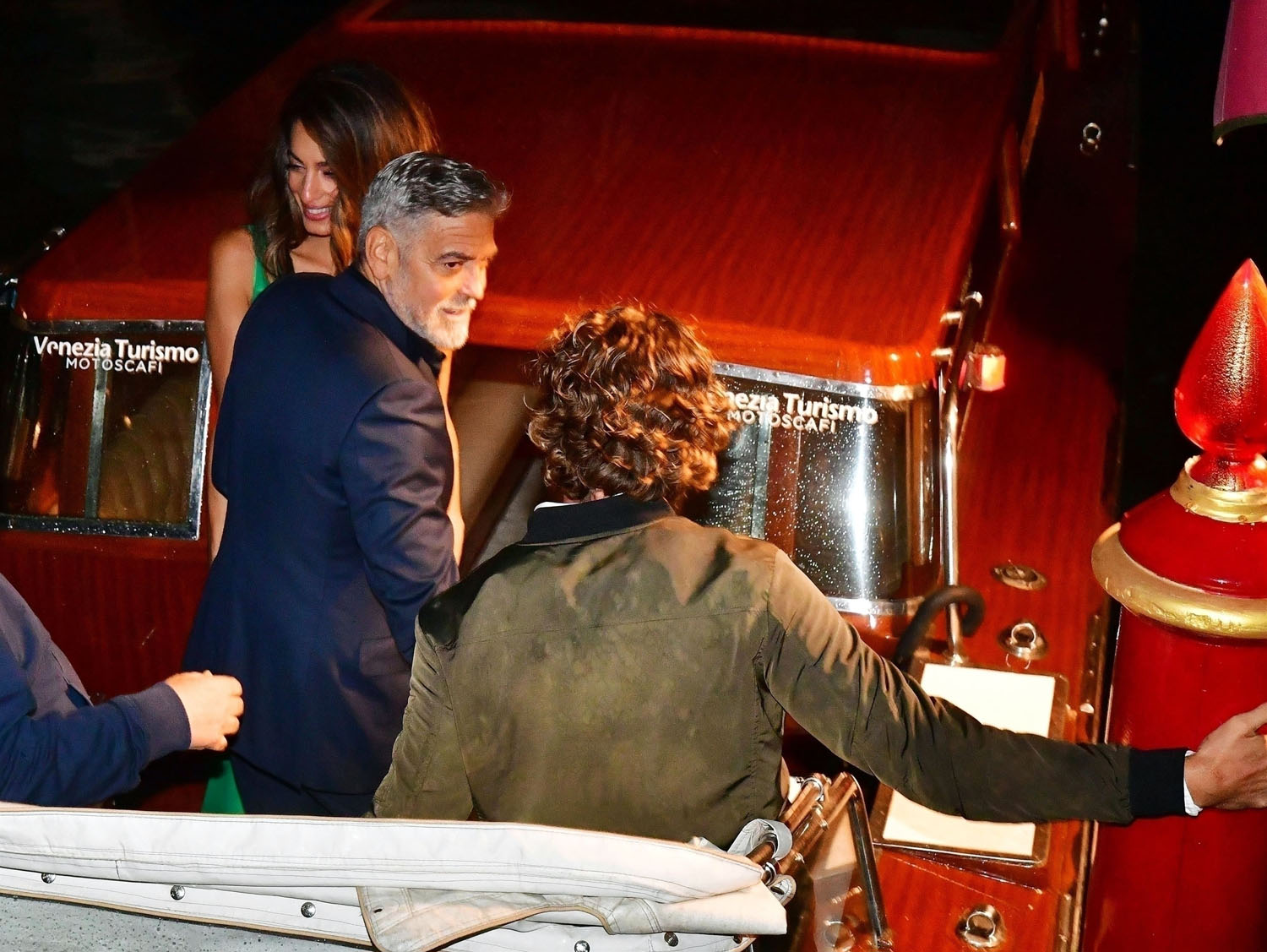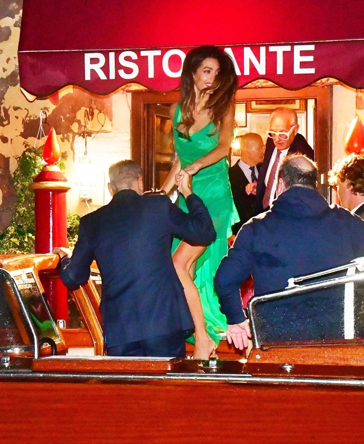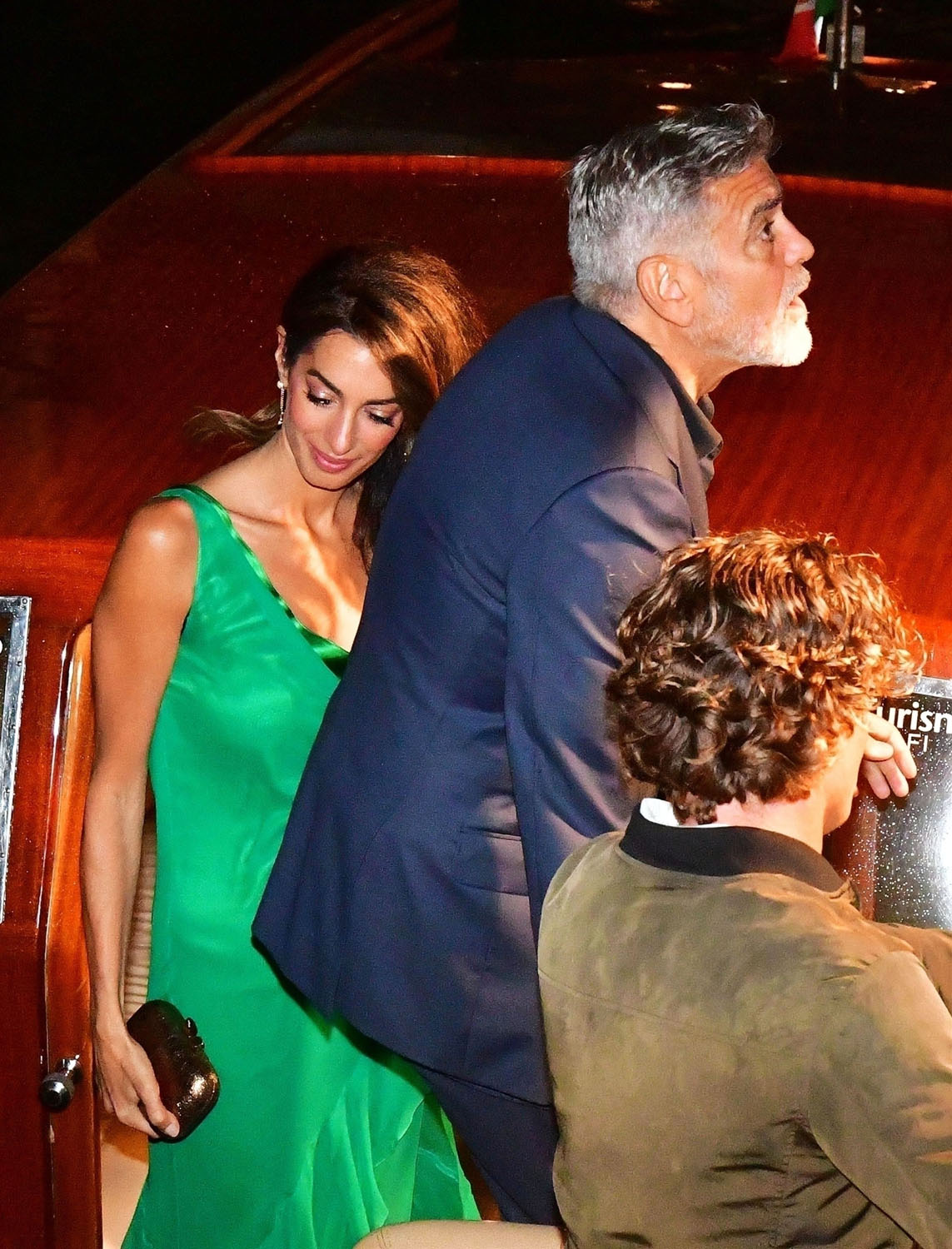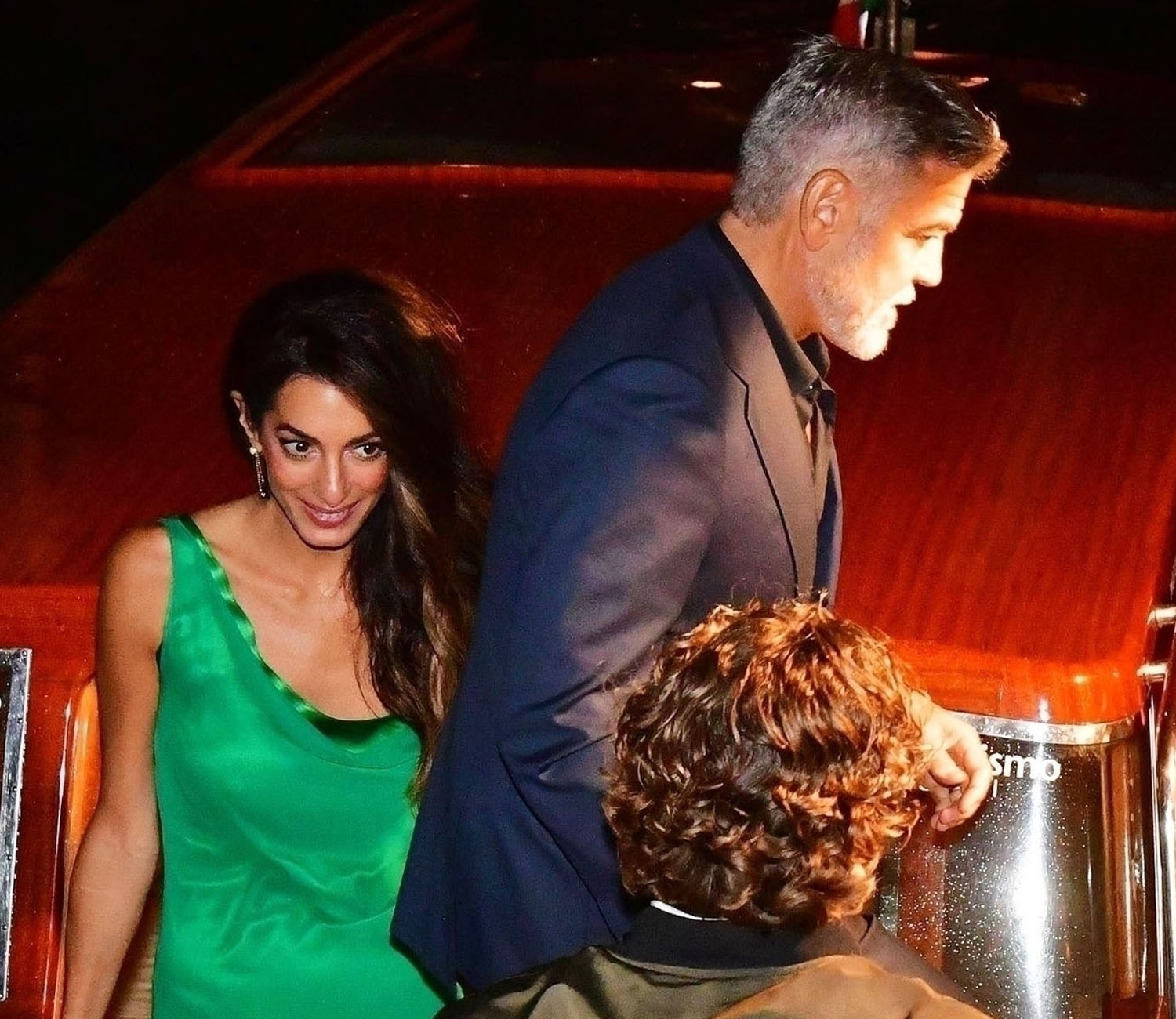 The Clooneys, however, always dress for dinner. Every dinner for Amal is like a red carpet – this green is spectacular on her, and the hair is GIVING tonight.