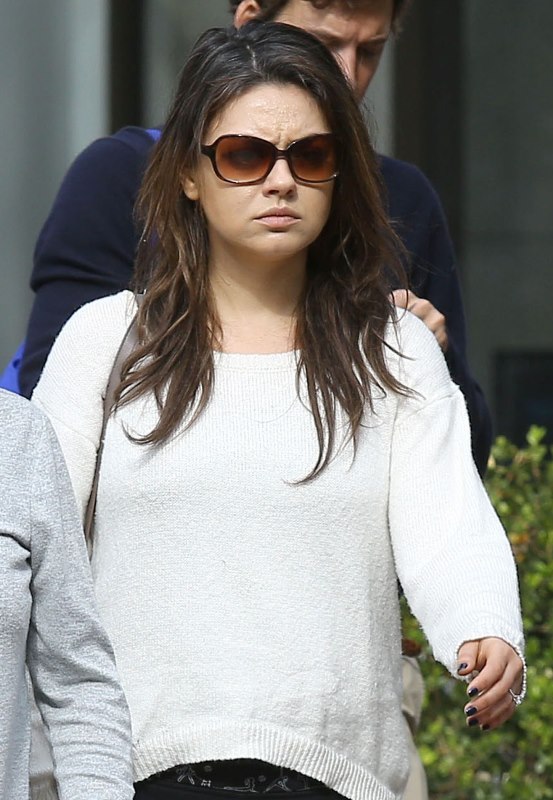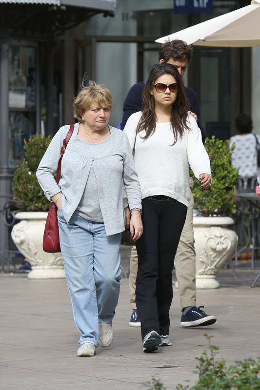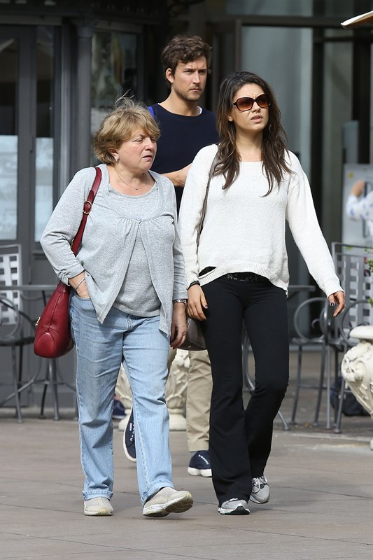 Mila Kunis is wearing a huge ring. Check it out yesterday when she stepped out to go shopping with her mother. In sweats. With photographers all over the place. And no attempt to hide it. In other words, they’re ready to let us know that it’s happening. She’s ready to let us know that she wants to marry that…idiot.