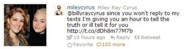 Tish Cyrus, Miley’s mother, filed for divorce from Billy Ray Cyrus 10 days ago. Around that time, Miley tweeted at her dad, apparently because she couldn’t reach him by private communication, social networking being her last resort. Then, last week, the Cyrus family was photographed together with their younger children. Tish and Billy Ray seemed close, prompting speculation that they’d reconciled.