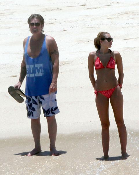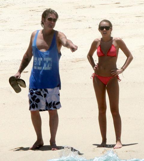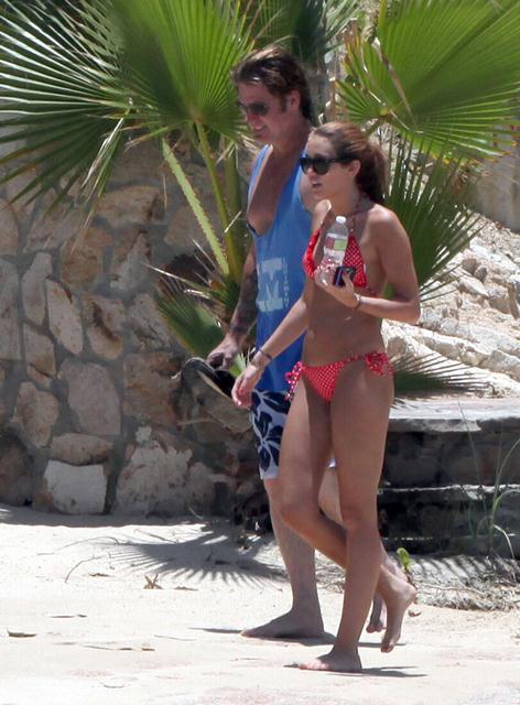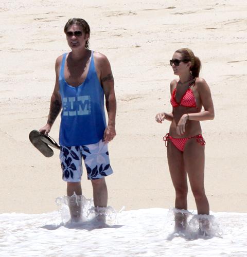 Miley Cyrus is currently on holiday with her dad in Mexico, photographed on the beach yesterday at their resort. It’s a brief break before heavy promotion for her upcoming new album Can’t Be Tamed dropping June 22nd.