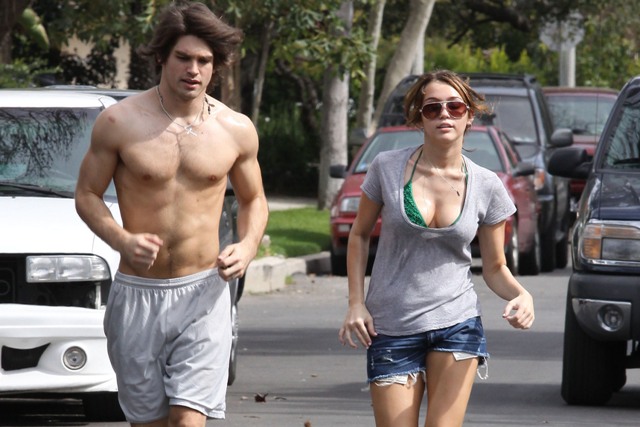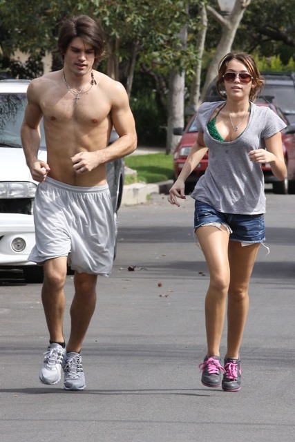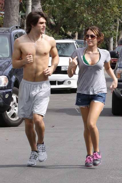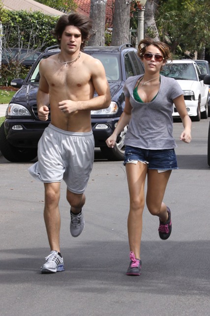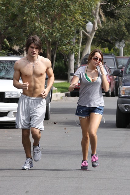 Anyway, this is JailBait Miley Cyrus running with her famewhore of a lame sh-ts boyfriend Justin Gaston, the 20 year old wasting his time “not f-cking” his 16 year old bible thumping girlfriend.