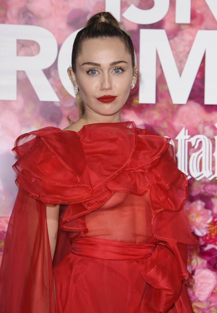 As Maria mentioned yesterday in Celebrity Social Media, Rebel Wilson revealed during press for Isn’t it Romantic that Liam Hemsworth had been hospitalised. He wasn’t with Miley Cyrus at the Grammys the other night. And he wasn’t well enough to attend the premiere last night. So Miley went to represent him in a caped Valentino gown that did its job. I’m not saying I love the dress but I do love that the dress was put to work. The work here is promoting the movie, a romantic comedy. And with Liam on the sidelines, Miley is carrying that responsibility. If he’d been with her, the headlines would have been “Miley and Liam’s romantic red carpet as married couple” or some sh-t. Now it’s her gown that’s making headlines. So, once again, we’re seeing fashion as part of the work.