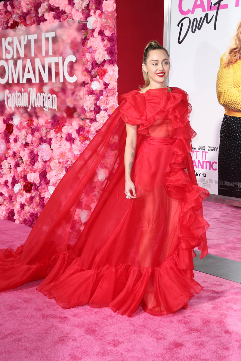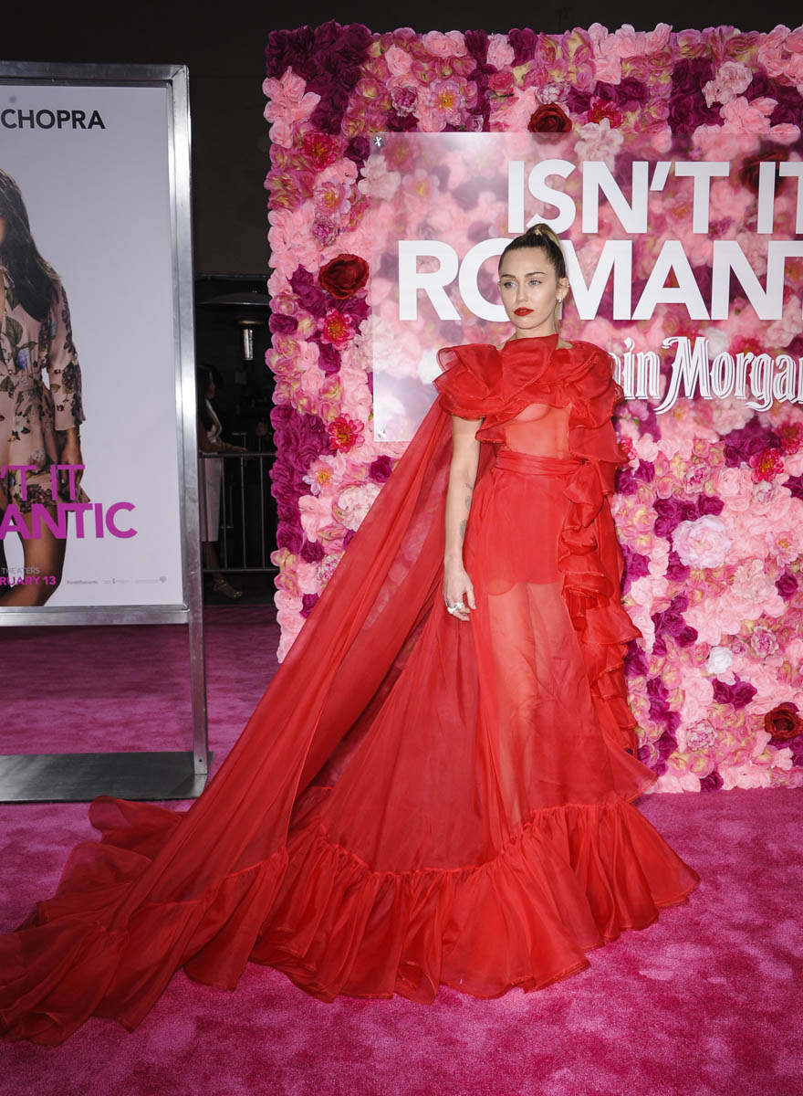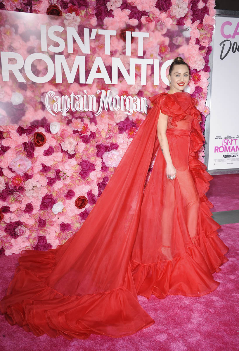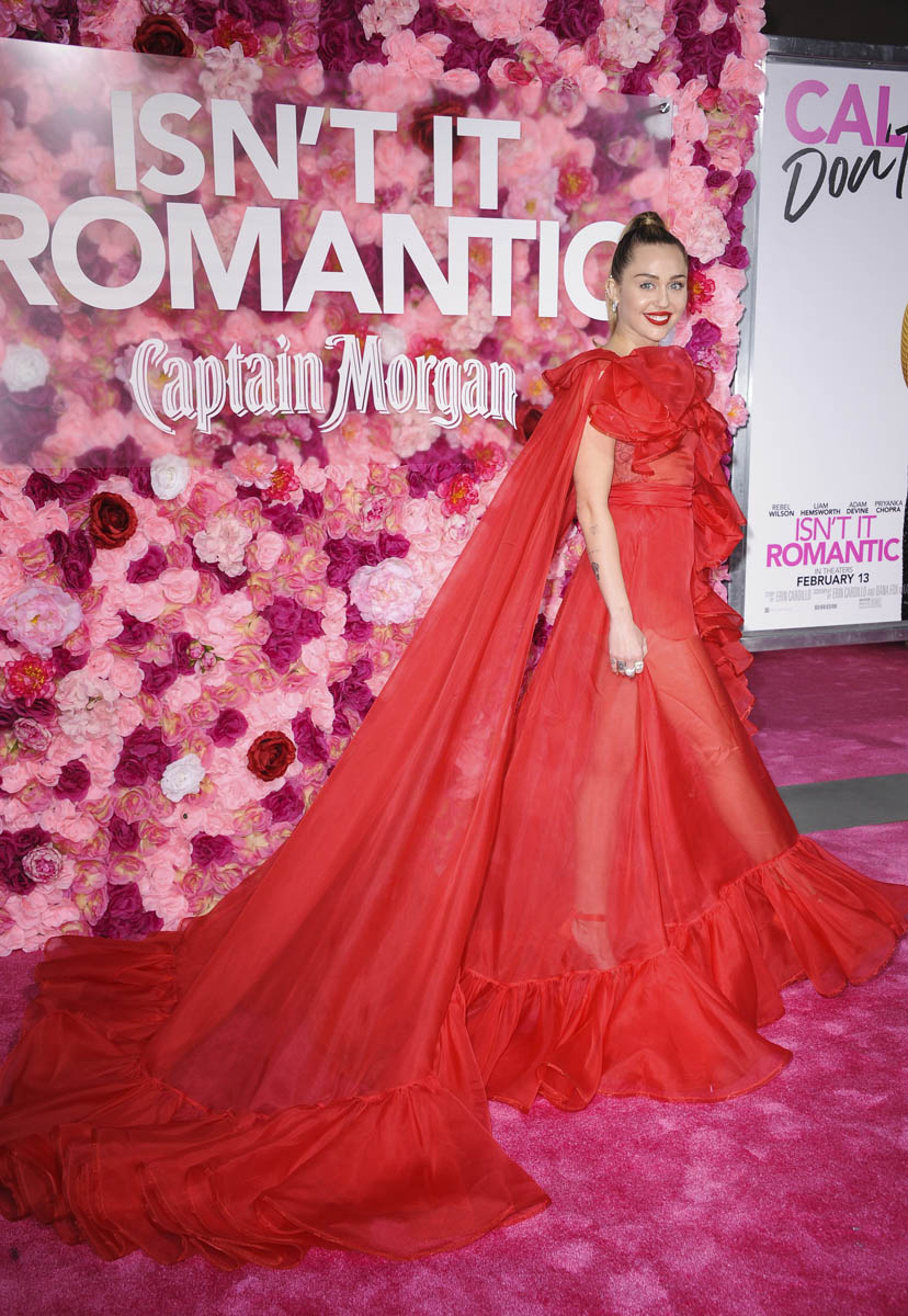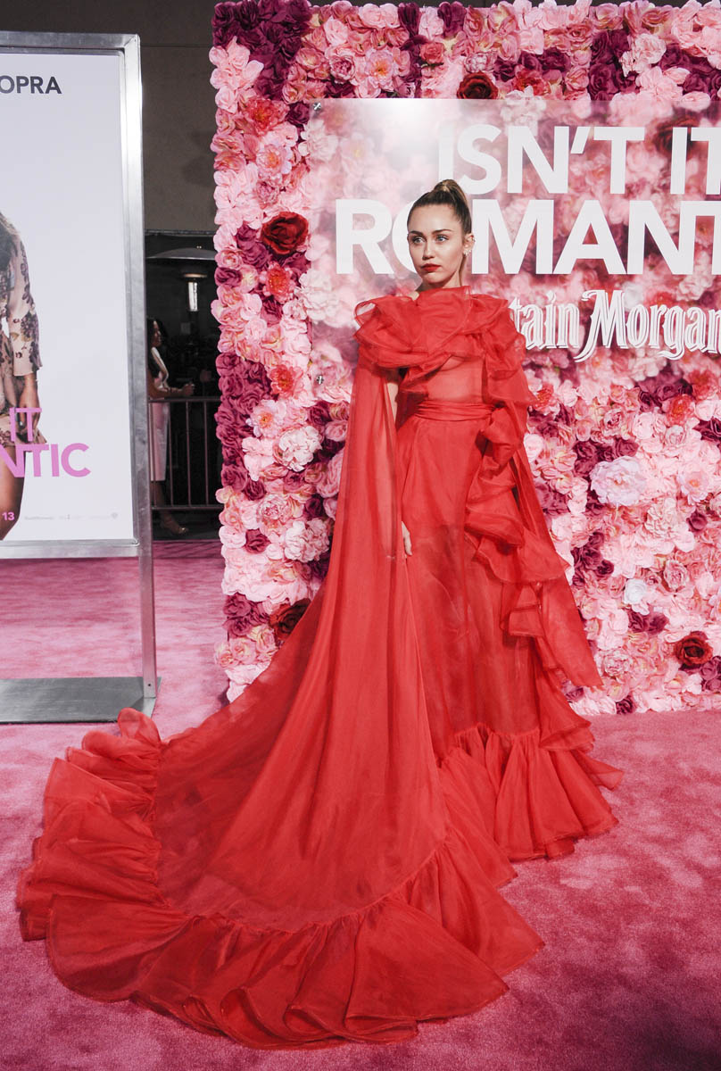 As Maria mentioned yesterday in Celebrity Social Media, Rebel Wilson revealed during press for Isn’t it Romantic that Liam Hemsworth had been hospitalised. He wasn’t with Miley Cyrus at the Grammys the other night. And he wasn’t well enough to attend the premiere last night. So Miley went to represent him in a caped Valentino gown that did its job. I’m not saying I love the dress but I do love that the dress was put to work. The work here is promoting the movie, a romantic comedy. And with Liam on the sidelines, Miley is carrying that responsibility. If he’d been with her, the headlines would have been “Miley and Liam’s romantic red carpet as married couple” or some sh-t. Now it’s her gown that’s making headlines. So, once again, we’re seeing fashion as part of the work.