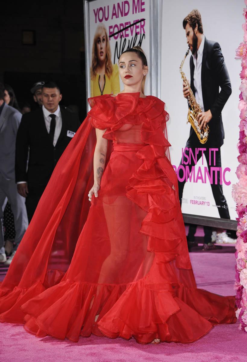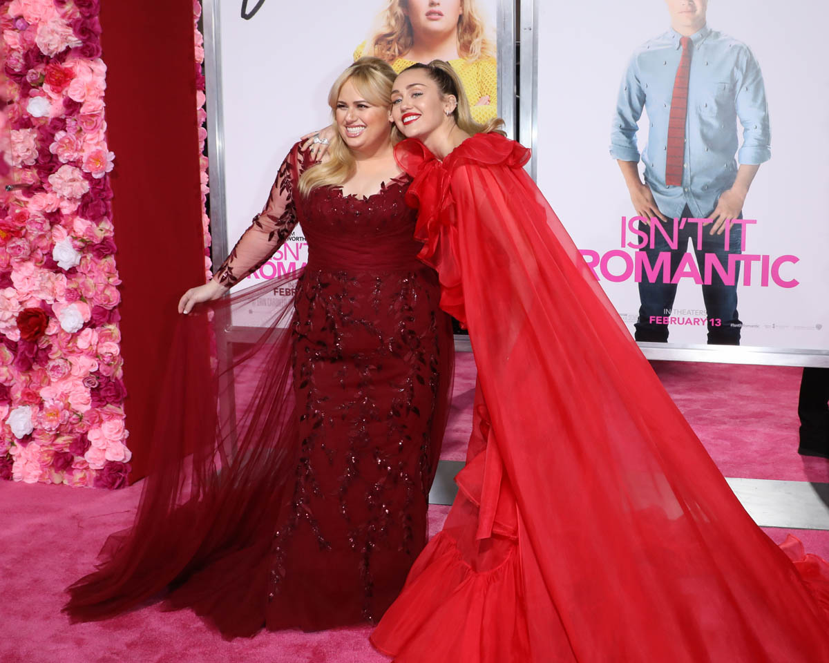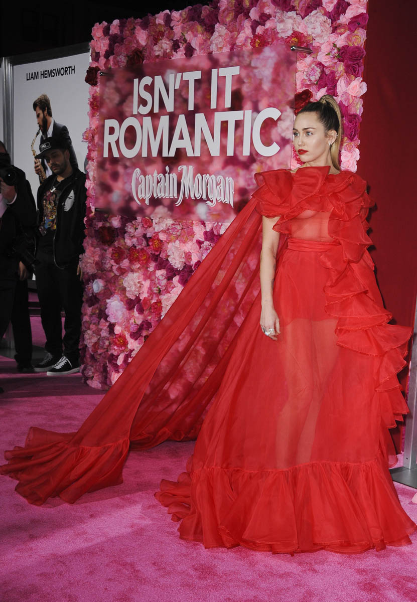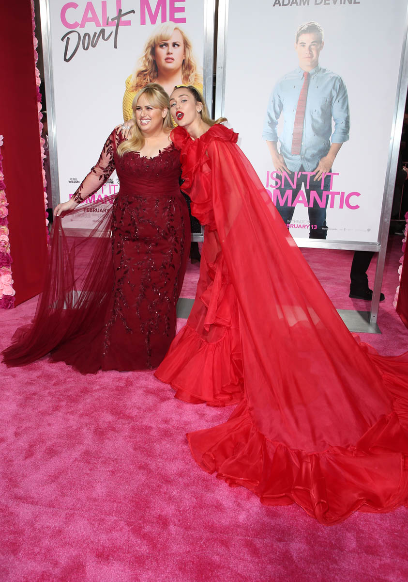 As Maria mentioned yesterday in Celebrity Social Media, Rebel Wilson revealed during press for Isn’t it Romantic that Liam Hemsworth had been hospitalised. He wasn’t with Miley Cyrus at the Grammys the other night. And he wasn’t well enough to attend the premiere last night. So Miley went to represent him in a caped Valentino gown that did its job. I’m not saying I love the dress but I do love that the dress was put to work. The work here is promoting the movie, a romantic comedy. And with Liam on the sidelines, Miley is carrying that responsibility. If he’d been with her, the headlines would have been “Miley and Liam’s romantic red carpet as married couple” or some sh-t. Now it’s her gown that’s making headlines. So, once again, we’re seeing fashion as part of the work.