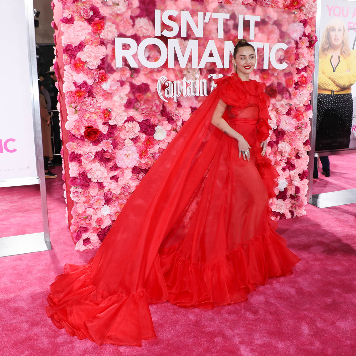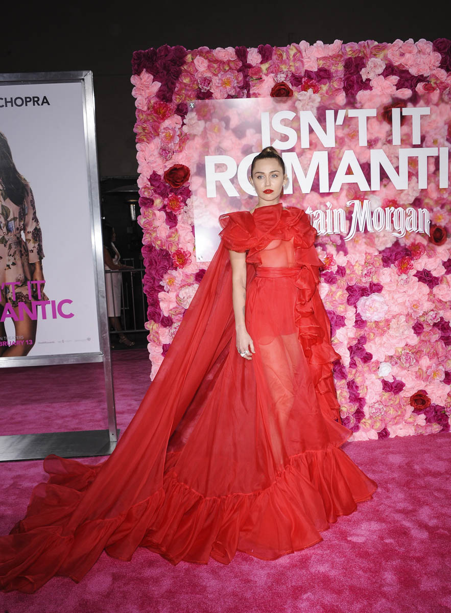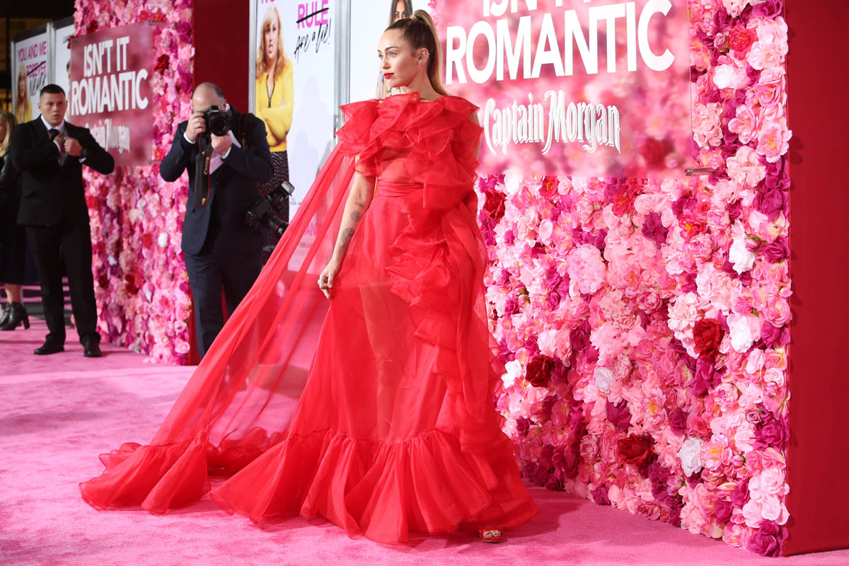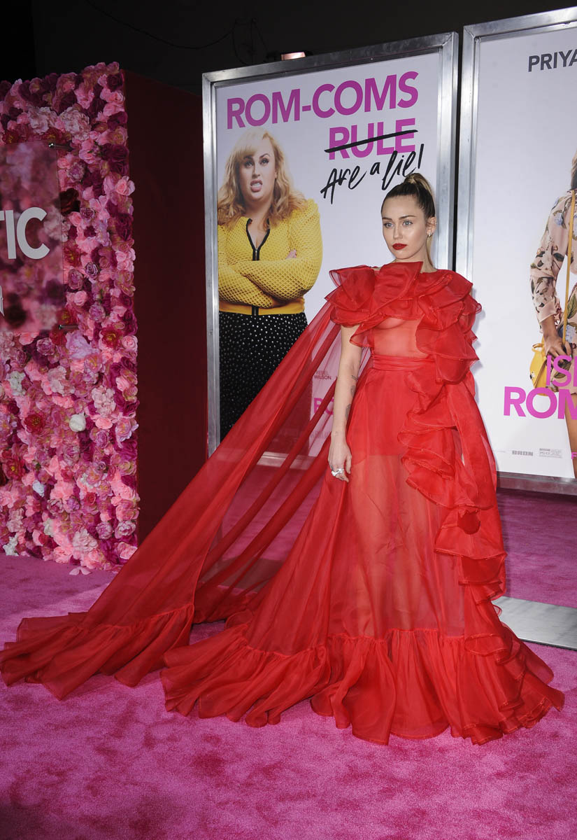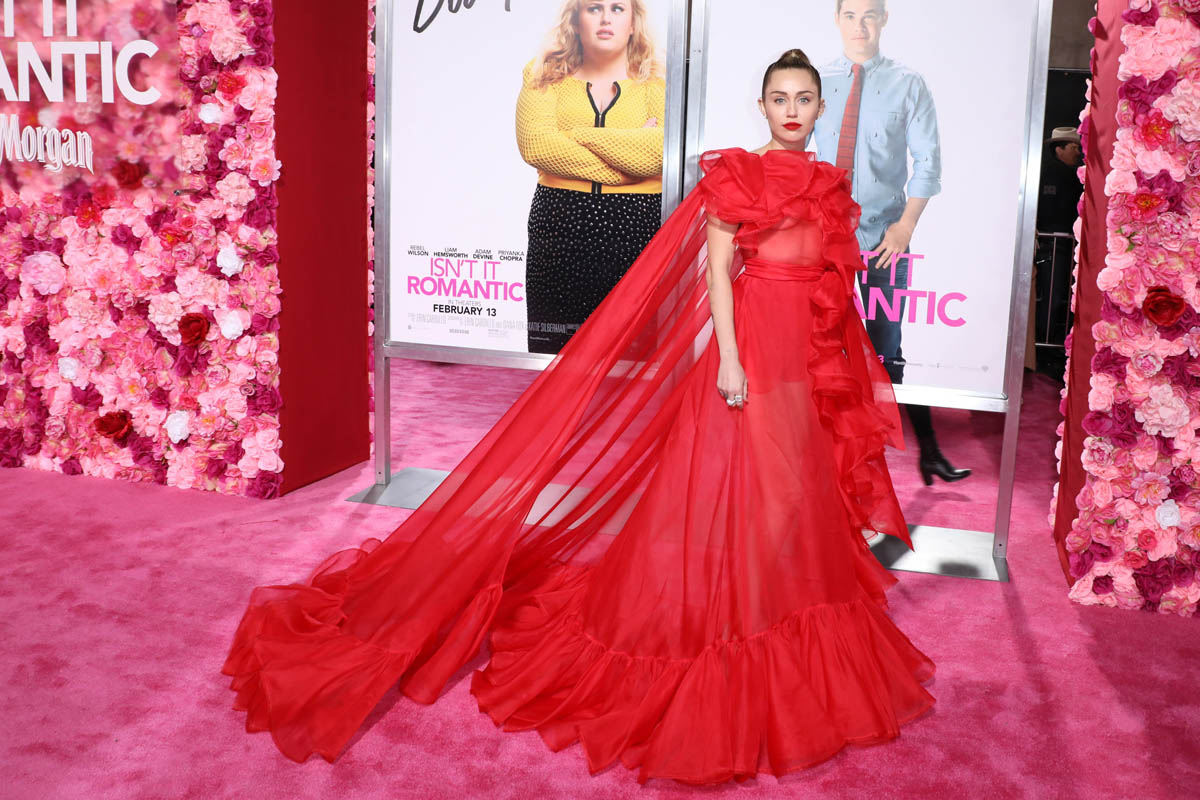 As Maria mentioned yesterday in Celebrity Social Media, Rebel Wilson revealed during press for Isn’t it Romantic that Liam Hemsworth had been hospitalised. He wasn’t with Miley Cyrus at the Grammys the other night. And he wasn’t well enough to attend the premiere last night. So Miley went to represent him in a caped Valentino gown that did its job. I’m not saying I love the dress but I do love that the dress was put to work. The work here is promoting the movie, a romantic comedy. And with Liam on the sidelines, Miley is carrying that responsibility. If he’d been with her, the headlines would have been “Miley and Liam’s romantic red carpet as married couple” or some sh-t. Now it’s her gown that’s making headlines. So, once again, we’re seeing fashion as part of the work.