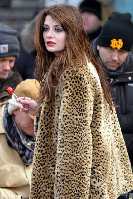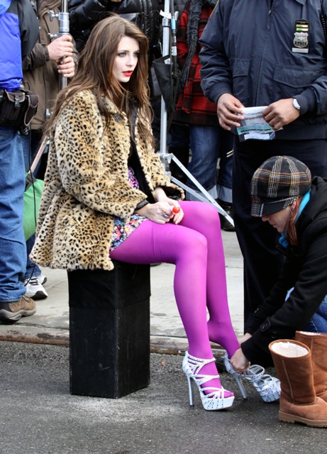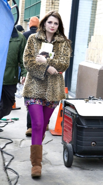 Here she is on set all hookered up. That coat though, she was wearing that coat on her own time last week, when she came home from the Burlington Coat Factory... Snort.