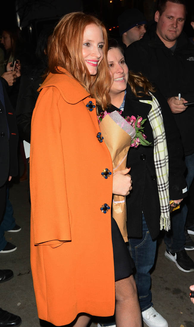 At the film’s New York premiere, Jessica talked about how playing a ruthless, ambitious woman was important to her. She said something very similar to Lainey and me at the film’s Toronto premiere on Monday. She also added that she originally thought a woman who loved her job this much would look like a mess, but that she loved playing up the glamour for the role, because this is a woman who always wants to look her best in order to be the best. Interestingly, the film’s credits gave special thanks to both The Room (a high-end department of the Hudson’s Bay Company), and Piaget. They both helped outfit Jessica for the shot-in-Toronto film.