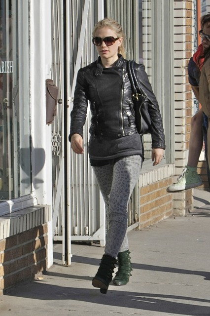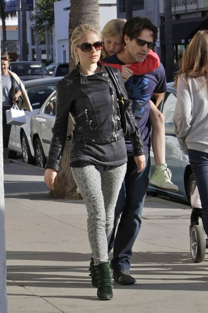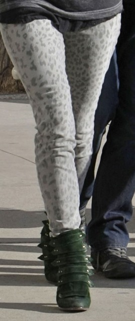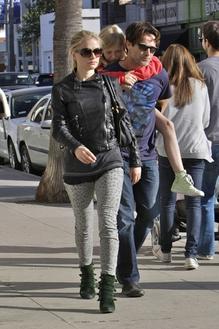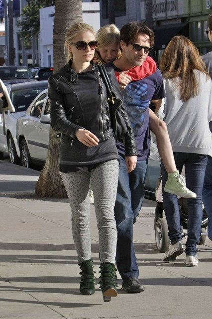 I first wrote about the spotted jeans trend a couple of weeks ago on Kate Moss – click here to see. Now it’s Anna Paquin, with husband Stephen Moyer and his daughter this weekend, pairing hers with green boots and a leather jacket. The jeans look great. The boots...?