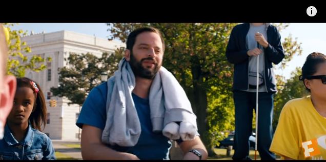 Nick Kroll of The Kroll Show fame stars as Bill, a sort of schlubby, vaguely depressed guy who, at the beginning of the movie, is completing a marathon with his athletic brother, Robbie (Adam Scott, Parks and Recreation). There’s a catch, though—Robbie is blind. And there’s another catch—he’s kind of a huge dick. Robbie is selfish, vain, shallow, and the brand of bore who goes on and on about his fitness routine. He’s objectively terrible, and Scott, though best known for playing sweetly cynical Ben Wyatt on Parks & Rec, is GREAT at playing dickheads, so Robbie is a Grade A dickhead. But his blindness means everyone around him is insanely conciliatory and forgiving of every bad personality trait because he’s just so brave!