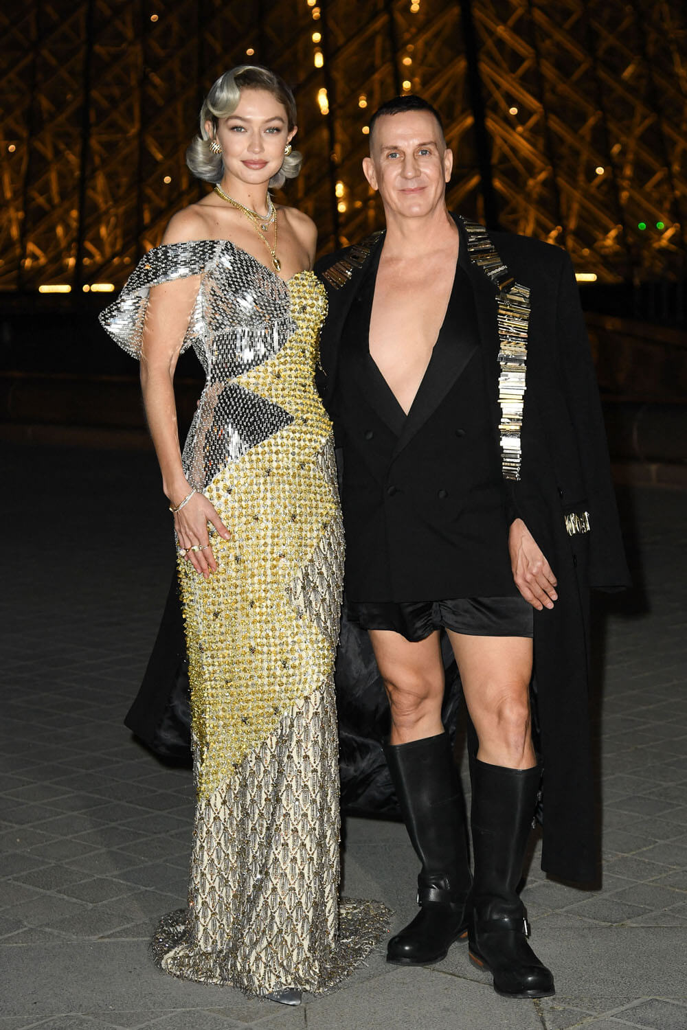 And here’s Gigi Hadid with Jeremy Scott, in a dress that’s mashed together from three previous Moschino designs, with hair to match. Super into this grey tone on her, I hope she keeps it for a while.