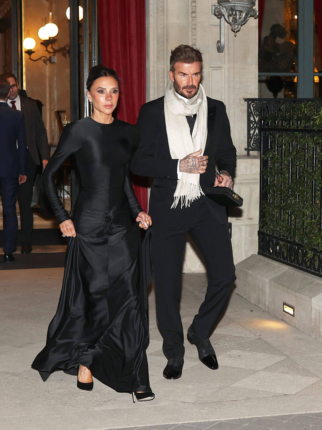 The Beckhams. Victoria’s already in Paris ahead of her next collection and this black gown on her, from her own house, is probably the best red carpet dress she’s ever designed.