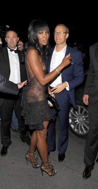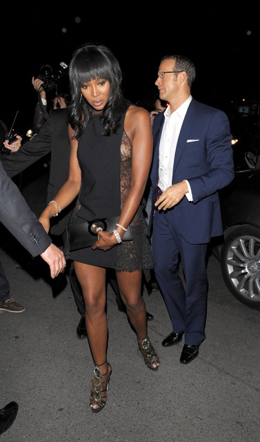 As for Naomi, she’s attended several events this week, and every time she has new hair. We’ve been wondering how long it takes her to change it up. For sure there’s an entire trunk of weaves and wigs that she’s brought along with her. Last night Naomi and Vlady hit up the Chopard party and were apparently all over each other. No phone attacks. Maybe he bought her something.