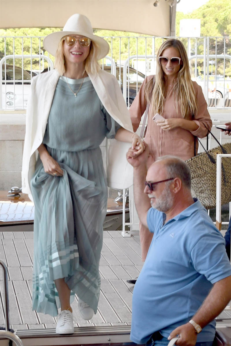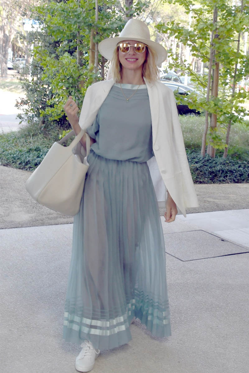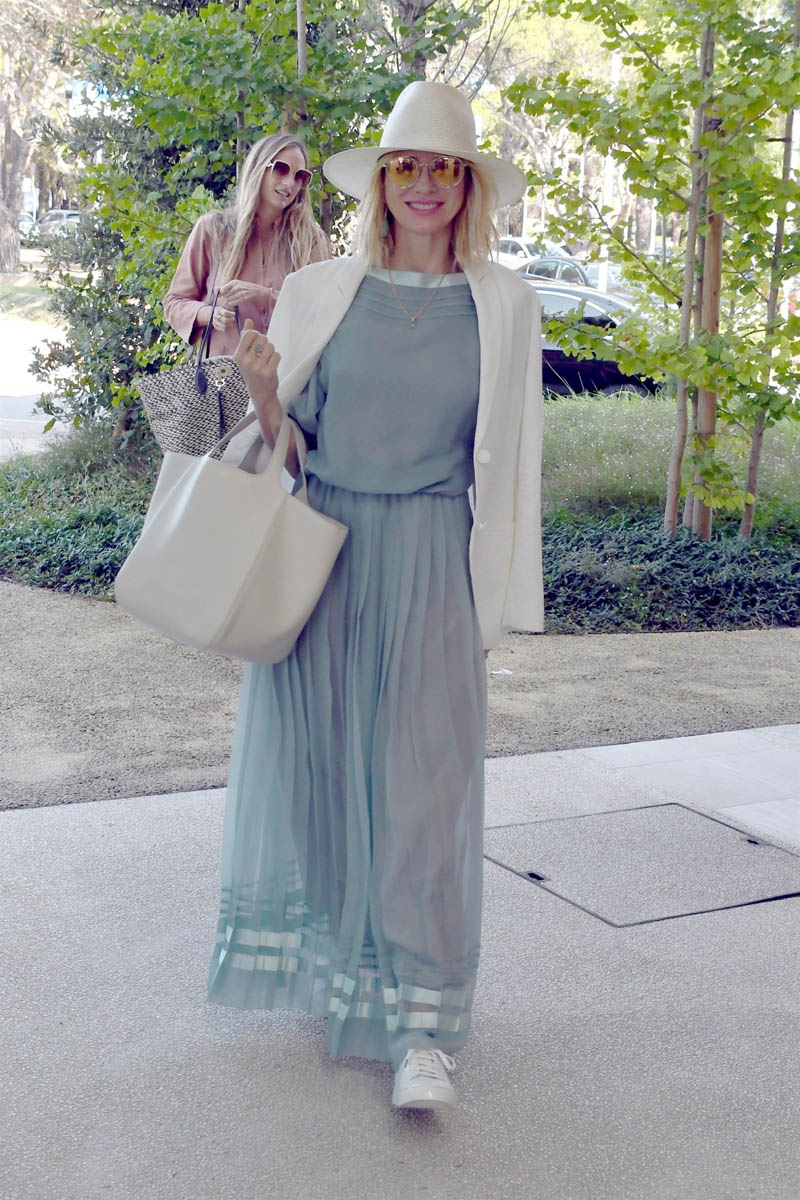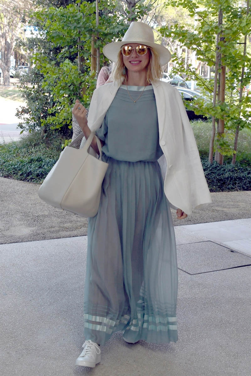 Excellent arrival outfit to start the Venice Film Festival where she’s on the jury. Like it couldn’t be more perfect. I really, really love this dress on Naomi Watts. Even though it’s technically baby blue, the colour is dull enough that to me it’s reading closer to grey. Love that the double stripe on the bottom of the skirt matches the lining around the collar. Love the jacket worn around her shoulders – this is a much better way to do it, please tell Meghan Markle. And, yes, finishing it all off with the hat but it’s the sneakers that really pull it all together. This, to me, is the kind of look that Meghan has tried to go for at times…but somehow misses the style vibe.
