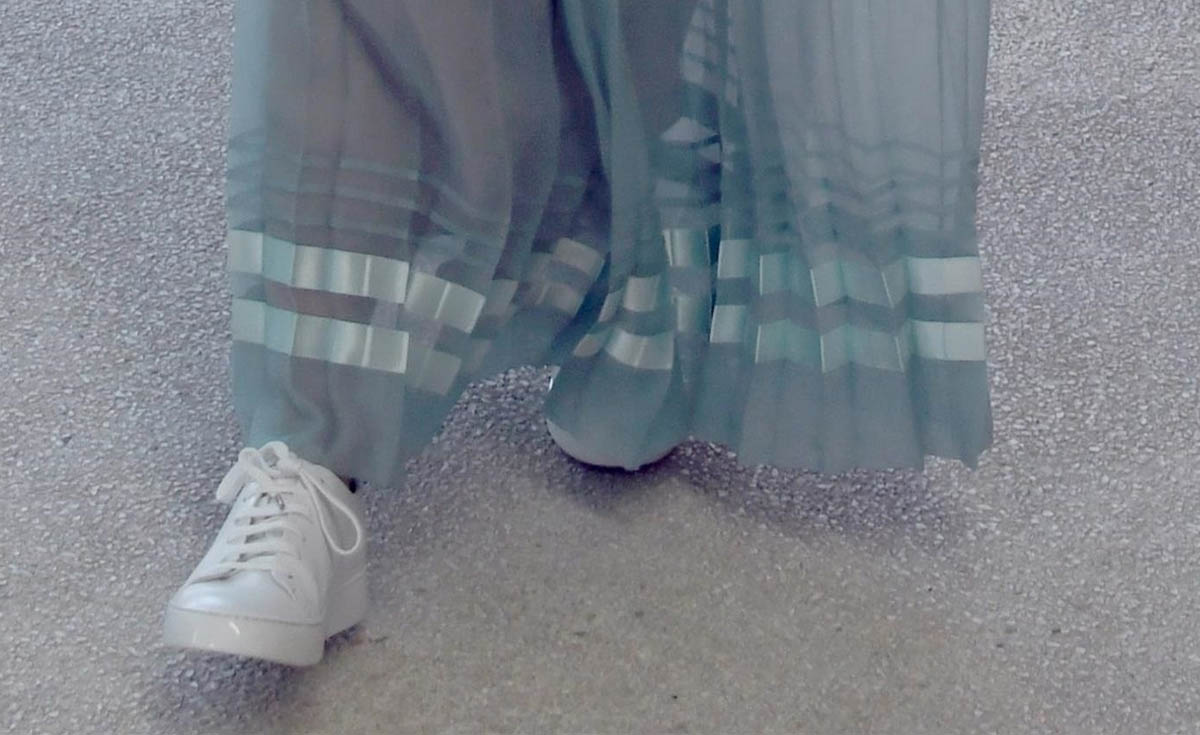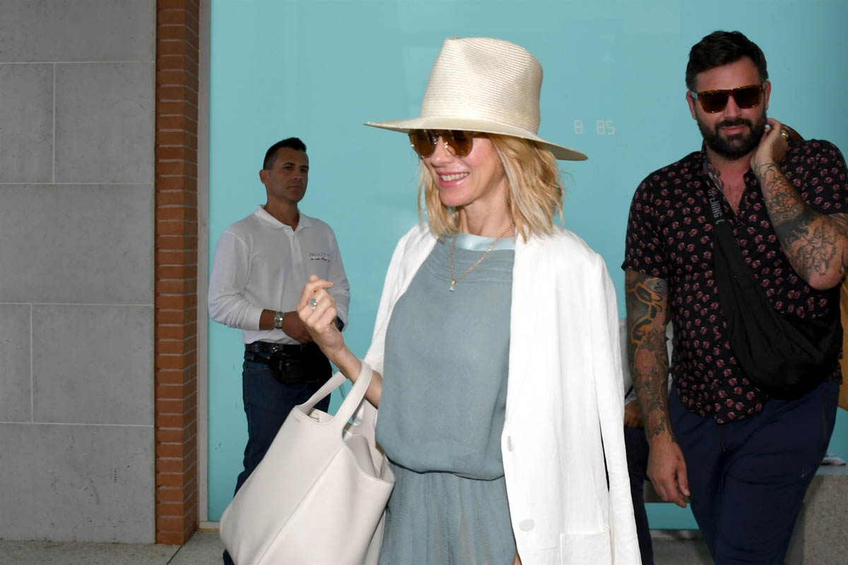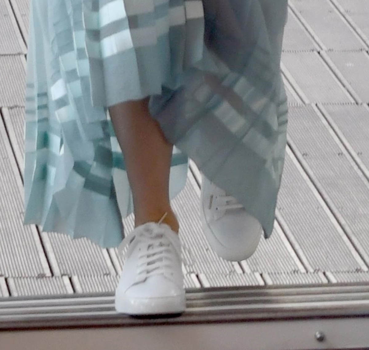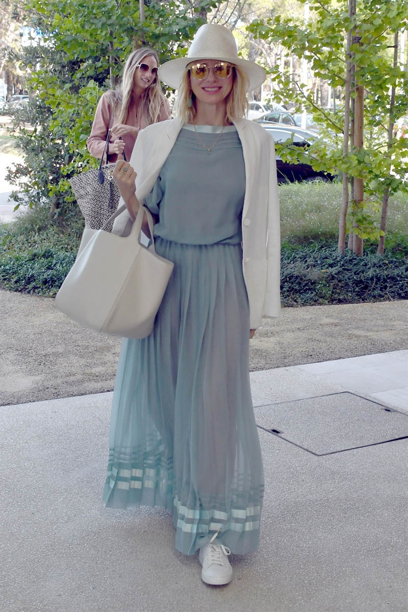 Excellent arrival outfit to start the Venice Film Festival where she’s on the jury. Like it couldn’t be more perfect. I really, really love this dress on Naomi Watts. Even though it’s technically baby blue, the colour is dull enough that to me it’s reading closer to grey. Love that the double stripe on the bottom of the skirt matches the lining around the collar. Love the jacket worn around her shoulders – this is a much better way to do it, please tell Meghan Markle. And, yes, finishing it all off with the hat but it’s the sneakers that really pull it all together. This, to me, is the kind of look that Meghan has tried to go for at times…but somehow misses the style vibe.