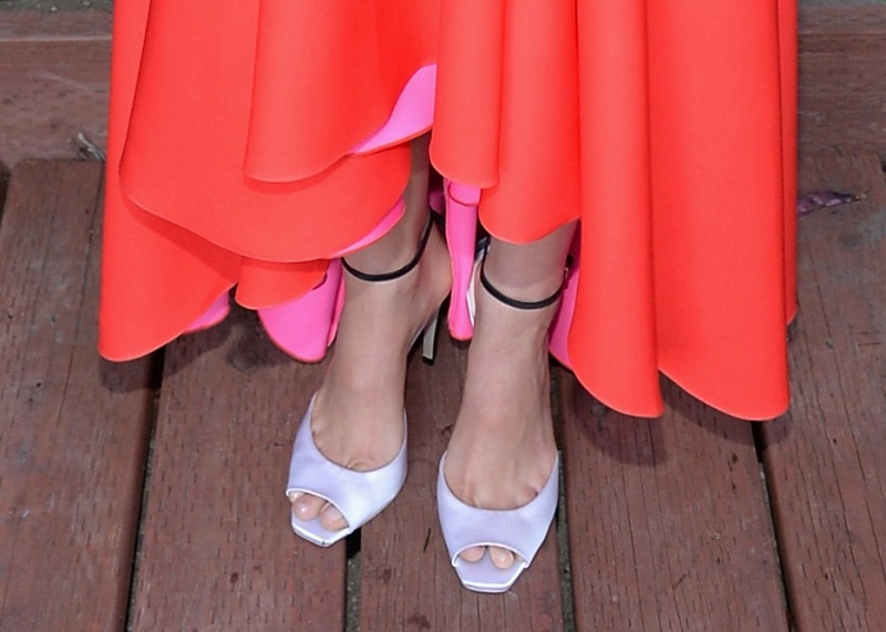Portman went out last night to support her husband Benjamin Millepied at his LA Dance Project Inaugural Benefit Gala. She wore red Dior. She looks like a teenager. I love that she still looks like a teenager -- a teenager in bad white/pale lilac satin shoes, good GOD.