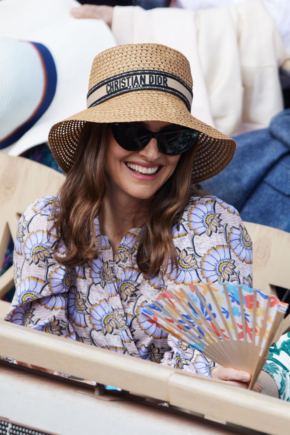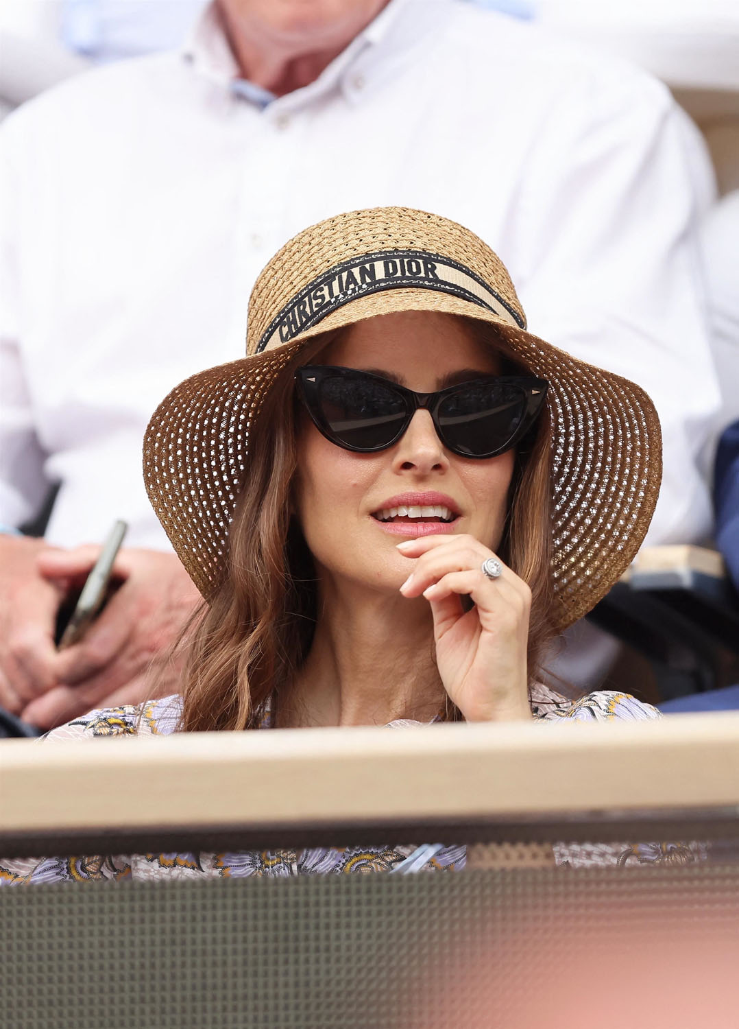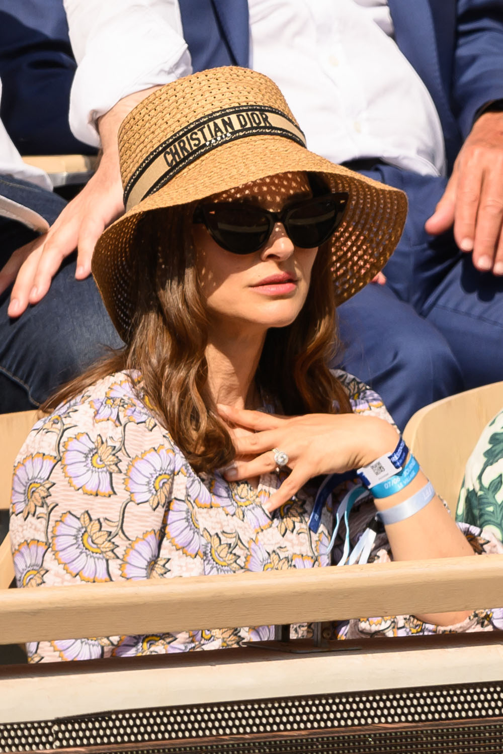 Natalie Portman was at the French Open yesterday in a very cute outfit – Dior hat for sun protection, floral dress, and espadrille wedges. That’s not the accessory that people were paying attention to though. Because at various points during the match, Natalie lifted her left hand and her engagement ring was prominently displayed. Up until a week ago this wouldn’t be a conversation but all that changed when French publication Voici reported that Natalie’s husband Benjamin Millepied was having an affair with Camille Etienne, a climate change activist.
