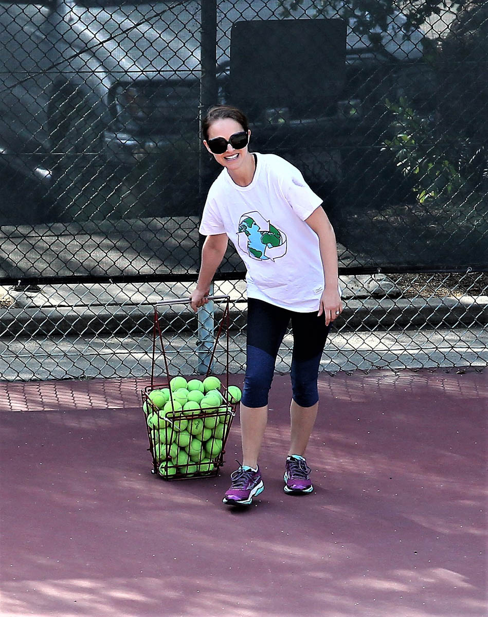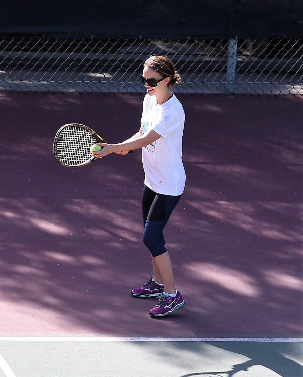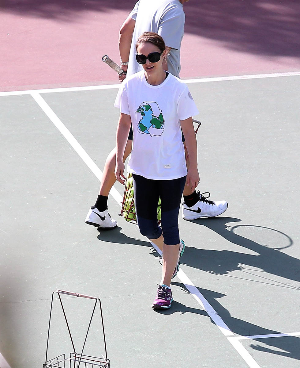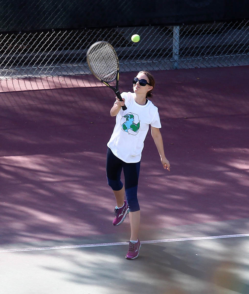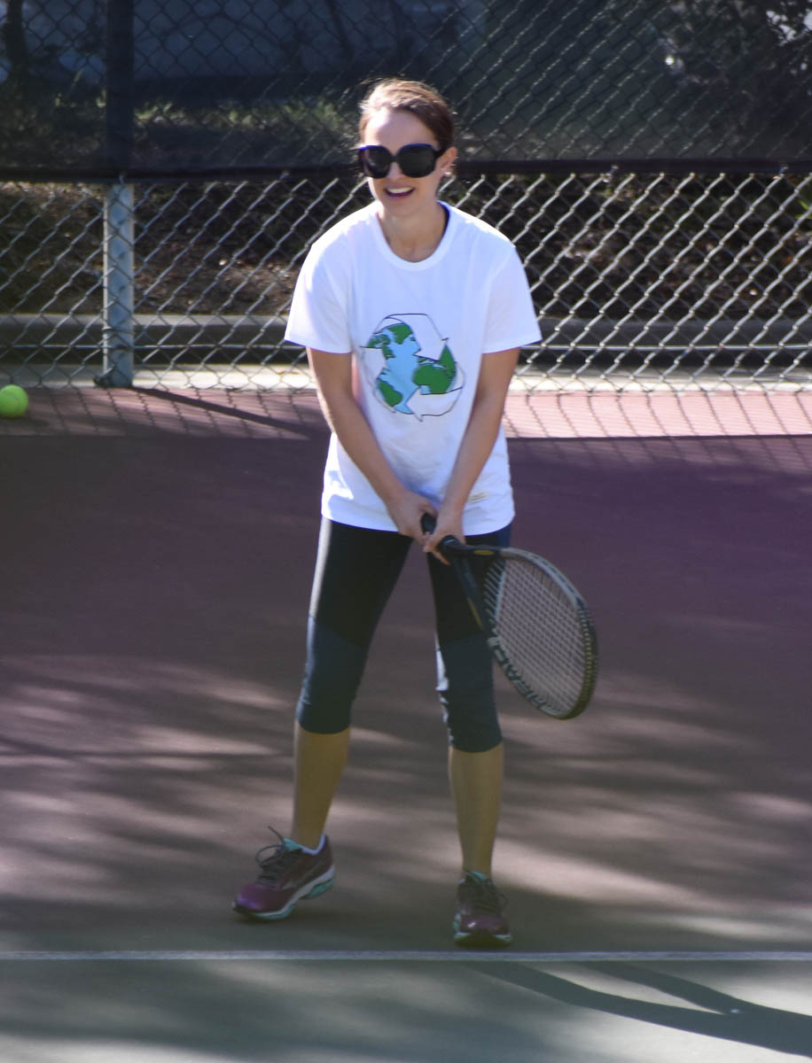 Here’s Natalie playing tennis today in LA. She’s been photographed often at the tennis court lately. Tennis is her thing right now, she’s taking lessons. Not that it matters, but I approve. I love tennis. When I play tennis though, I can’t keep my sunglasses on. Even when I golf I can’t keep my sunglasses on. I feel like I don’t see the ball right when my shades are still on. How is she playing with her sunglasses on? If you don’t have this problem, please advise on how I can fix mine.