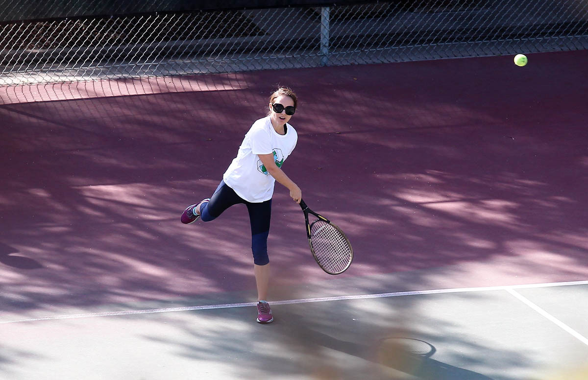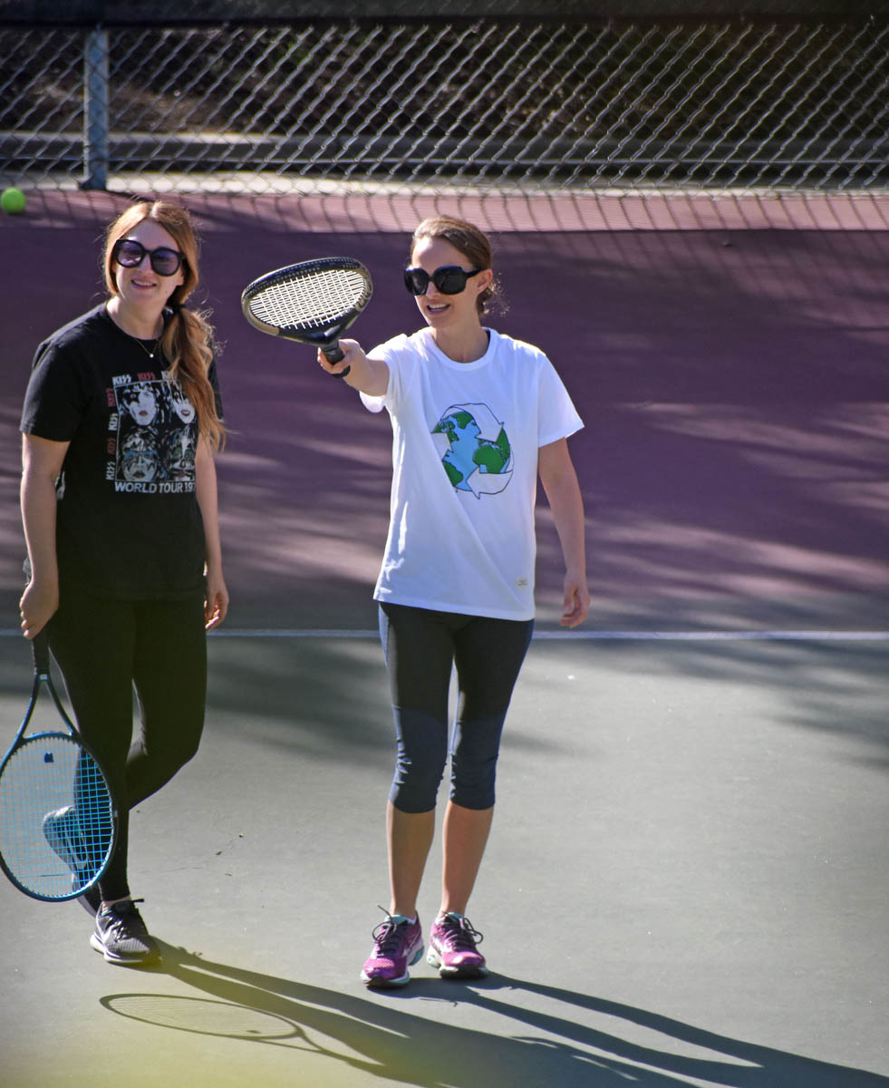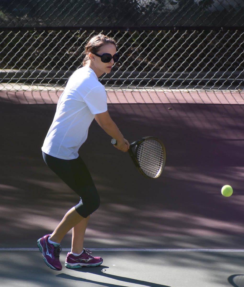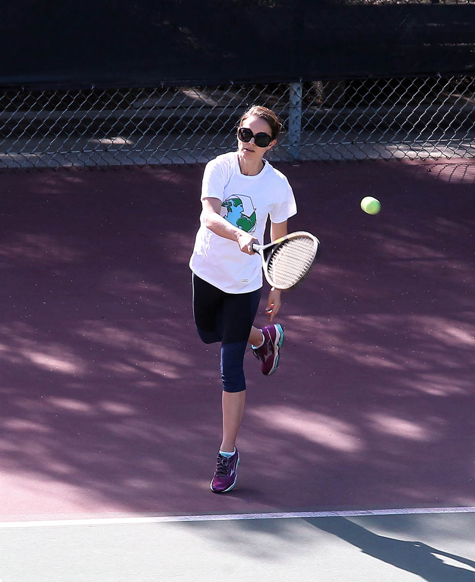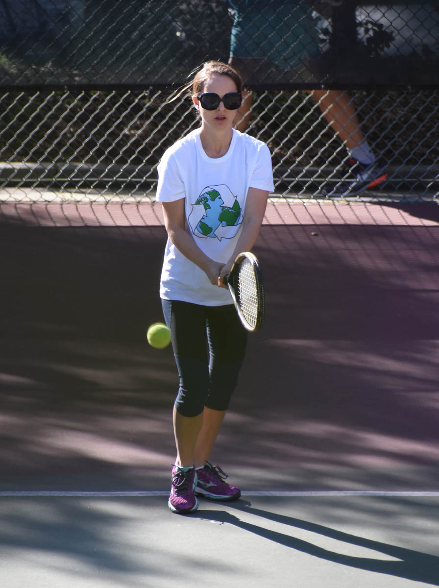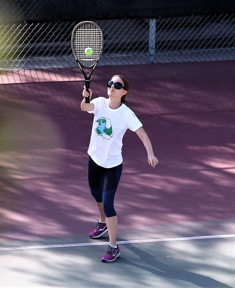 Here’s Natalie playing tennis today in LA. She’s been photographed often at the tennis court lately. Tennis is her thing right now, she’s taking lessons. Not that it matters, but I approve. I love tennis. When I play tennis though, I can’t keep my sunglasses on. Even when I golf I can’t keep my sunglasses on. I feel like I don’t see the ball right when my shades are still on. How is she playing with her sunglasses on? If you don’t have this problem, please advise on how I can fix mine.