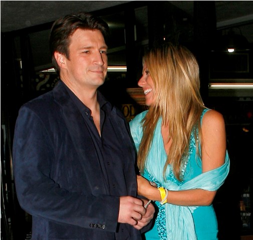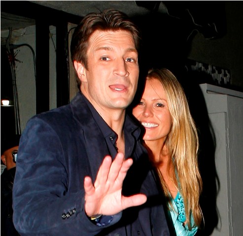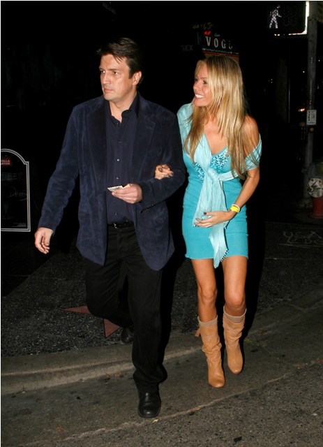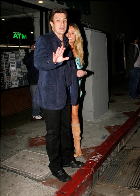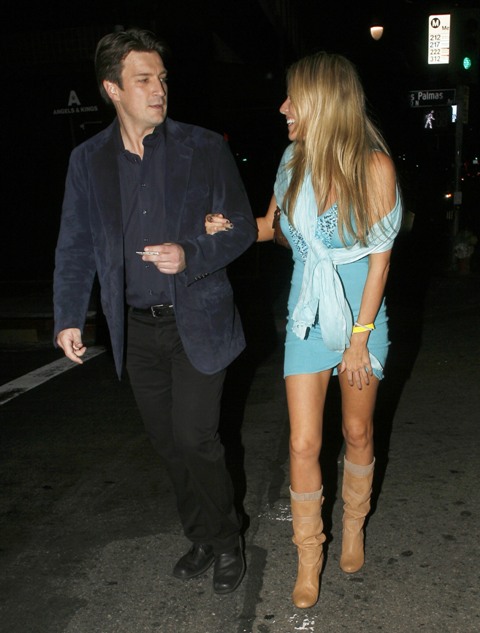 I receive a lot of requests for Nathan Fillion. And because he’s not a cover boy, he’s very rarely papped. It was a nice surprise then to see these shots of him, taken the other night, as he and his girlfriend were leaving dinner. Erm. I’m not sure if I’m down with her outfit. Why is she dressing like Miley Cyrus’s mom?