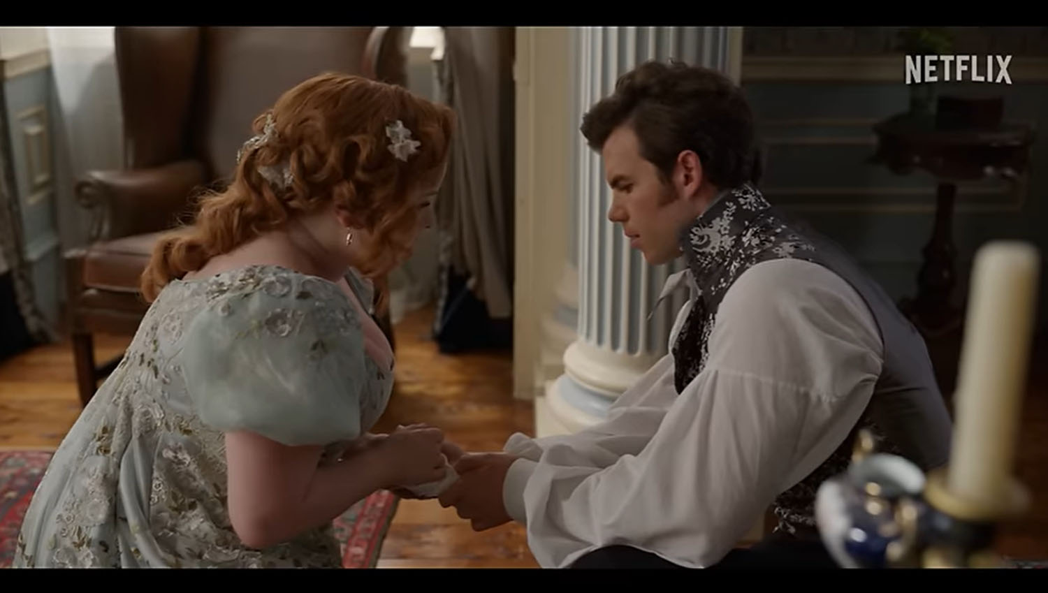 Anyway! They’ve come up with a new scenario for Penelope, driving her to marry in a hurry, but as the ton’s resident wallflower, she needs help. Colin to the rescue, he’s back in town and helping his friend hone her flirting skills so she can find a husband. I am just not super into any version of Colin Bridgerton, but Luke Newton looks suitably dashing—questionable male jewelry choices aside, that RING, Colin, REALLY—and I do love a good yearn. There is lots of YEARNING and even some PINING, and if season three gives us nothing but eight hours of delicious YEARNING and PINING, well, I’d be alright with that.