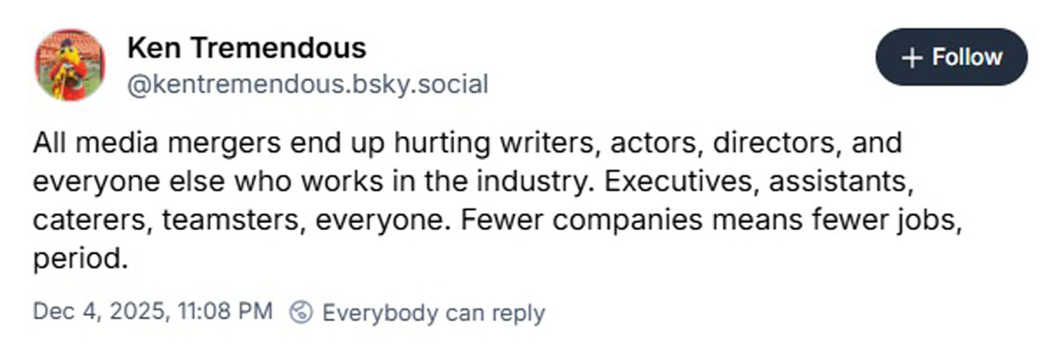 Make no mistake, this deal ultimately benefits no one but CEOs and the top shareholders at WBD and Netflix. This means another legacy studio being swallowed up, it means further contracting an industry already struggling, it means thousands more people out of work, at a time when AI is already driving job insecurity and anxiety. We’re racing to destroy the film industry, which supported a robust middle class for 100 years.